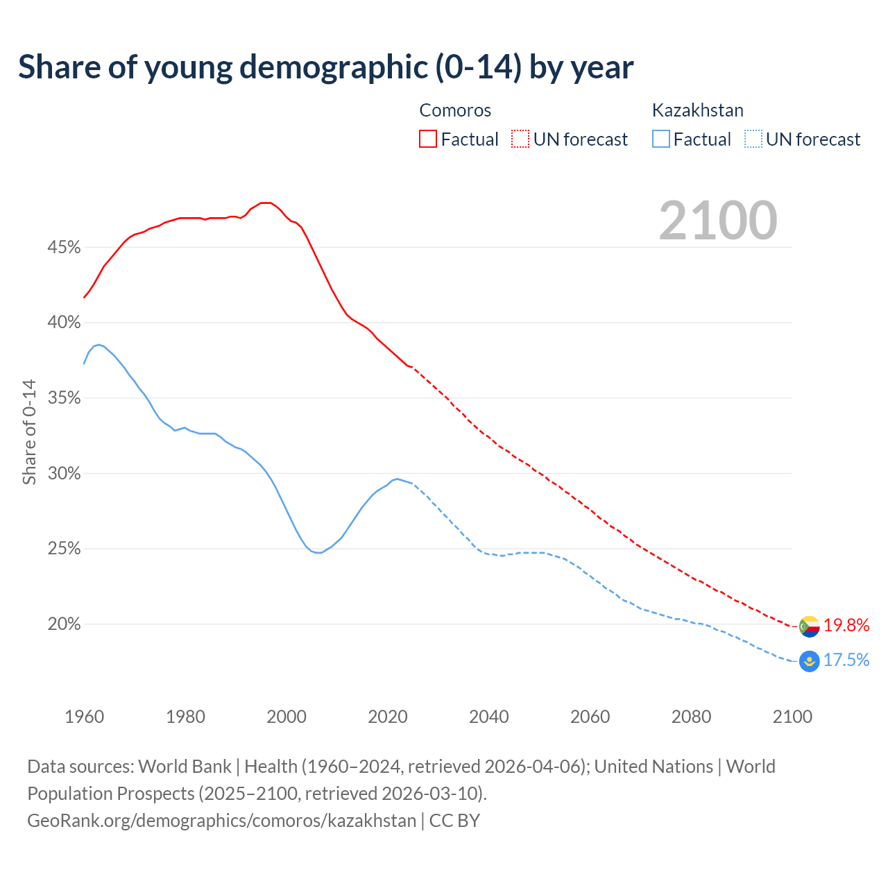 - The share of young demographic (0-15 years old) in Comoros is 37.1% vs 29.4% in Kazakhstan.