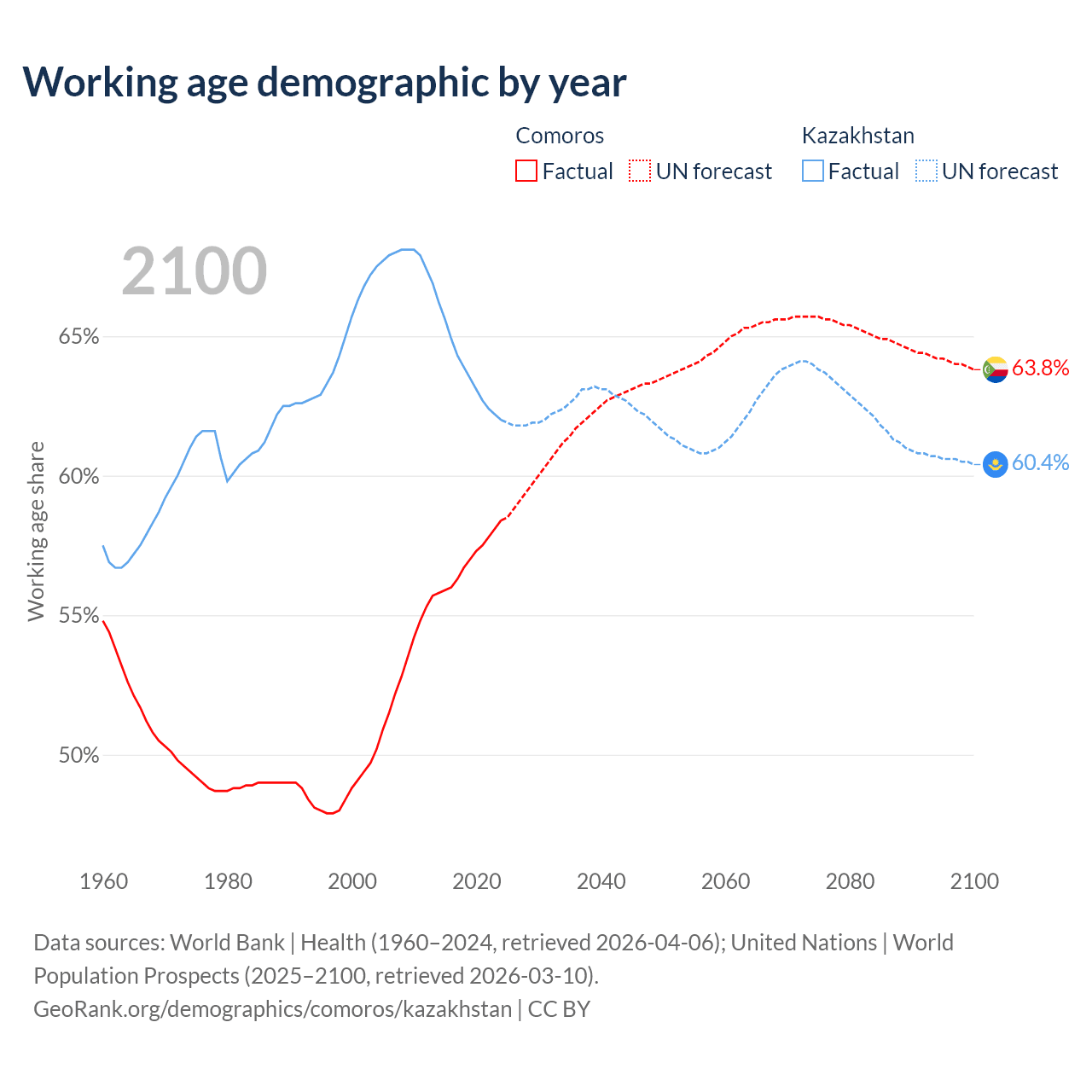 - Comoros has 528K working age adults (aged 15-64) vs 13.1M in Kazakhstan.