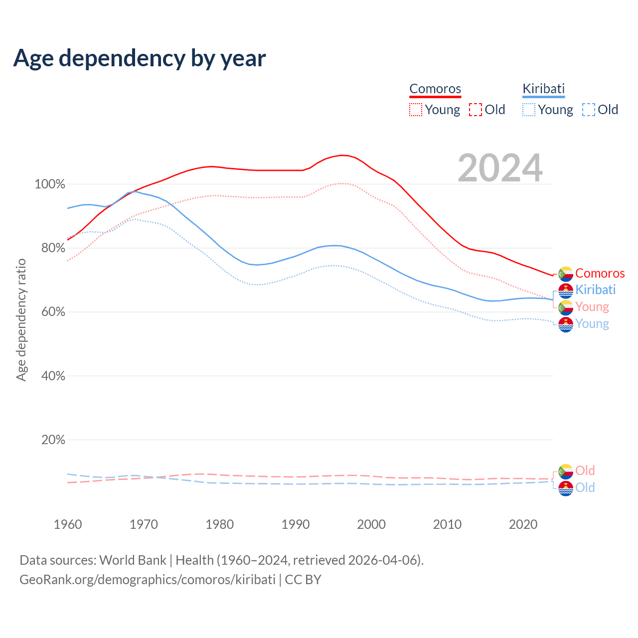 - The share of old-age demographic (65+) in Comoros is 4.47% vs 4.24% in Kiribati.