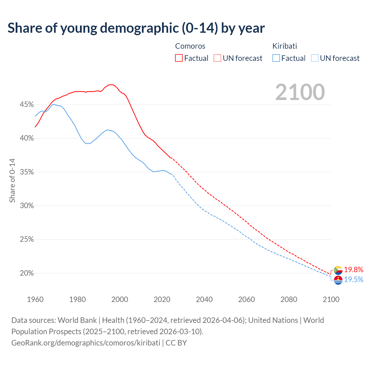 - The share of young demographic (0-15 years old) in Comoros is 37.1% vs 34.7% in Kiribati.