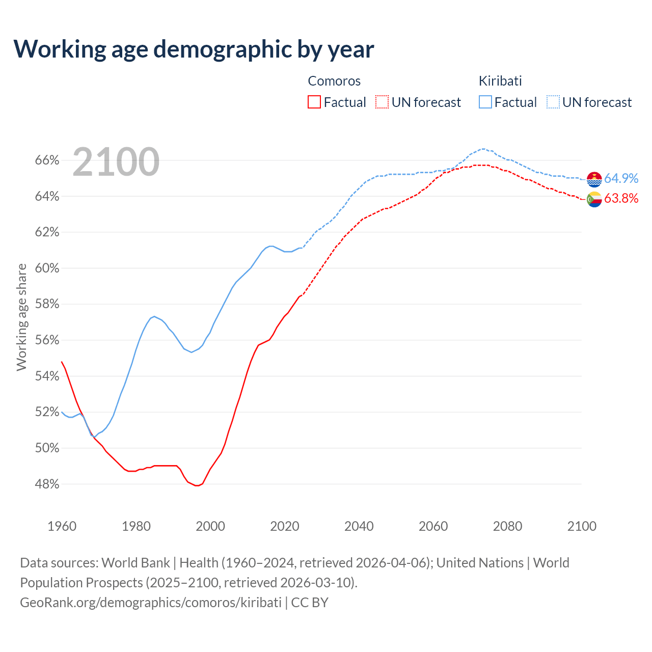 - Comoros has 528K working age adults (aged 15-64) vs 84.9K in Kiribati.