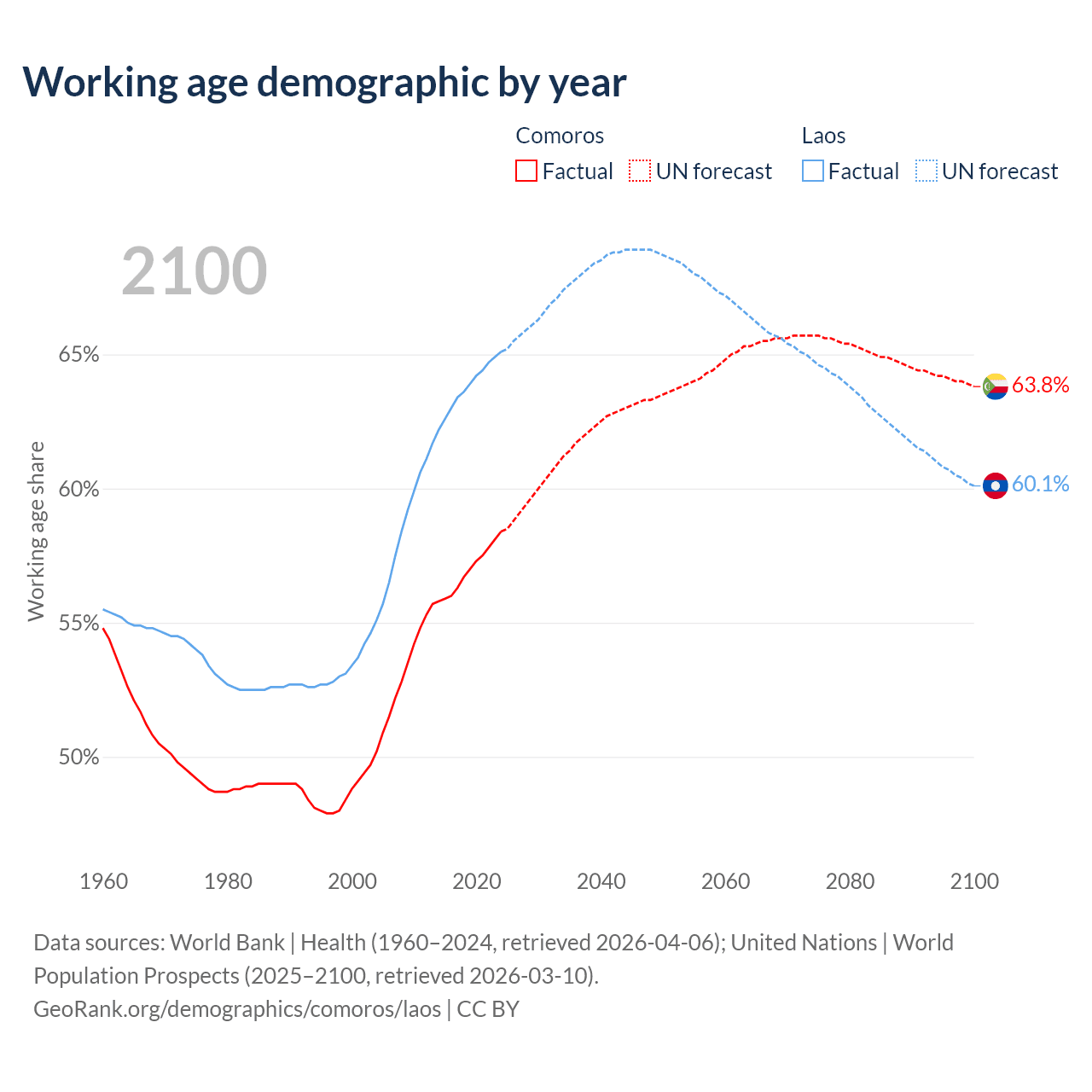 - Comoros has 528K working age adults (aged 15-64) vs 5.21M in Laos.