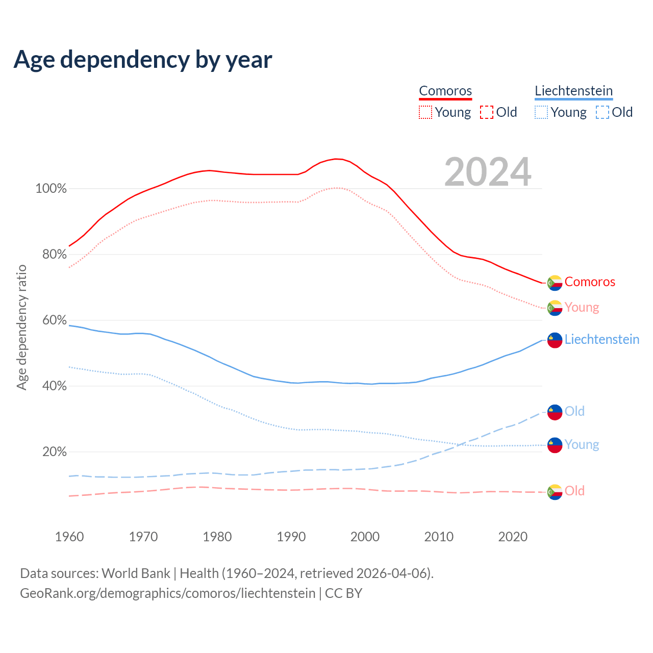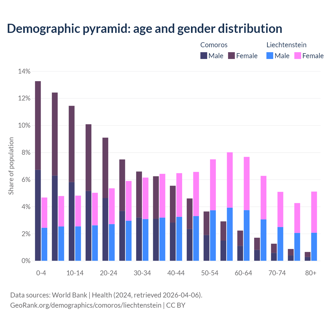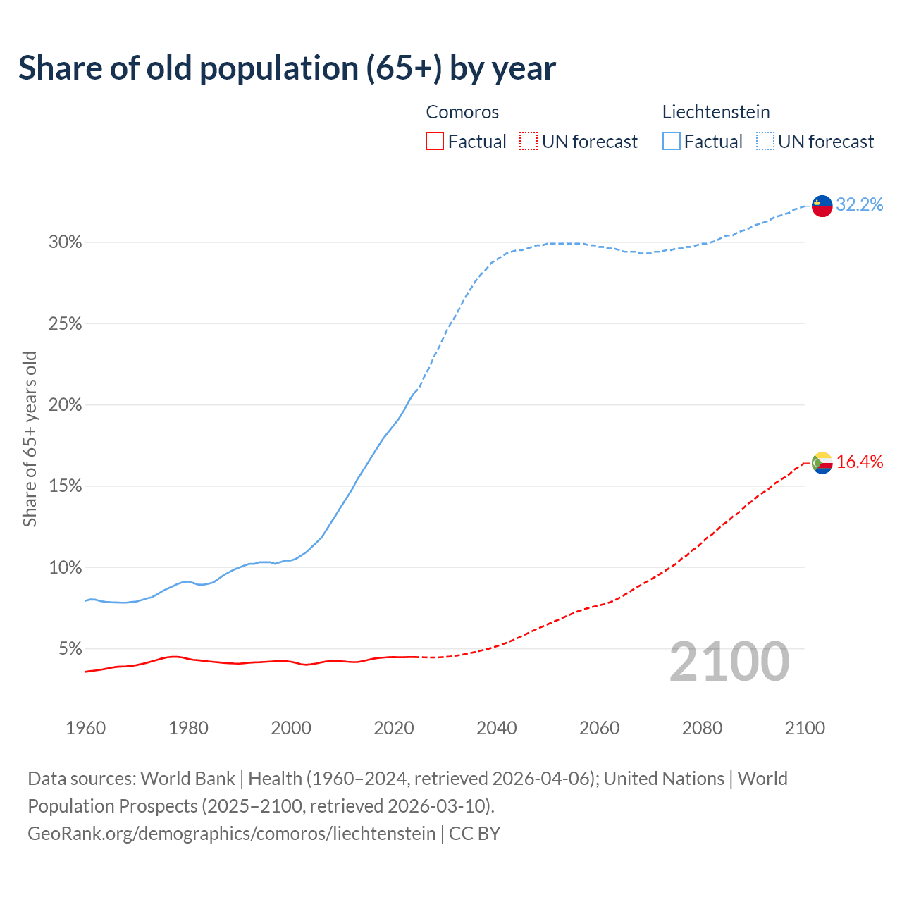 - The share of old-age demographic (65+) in Comoros is 4.47% vs 20.7% in Liechtenstein.