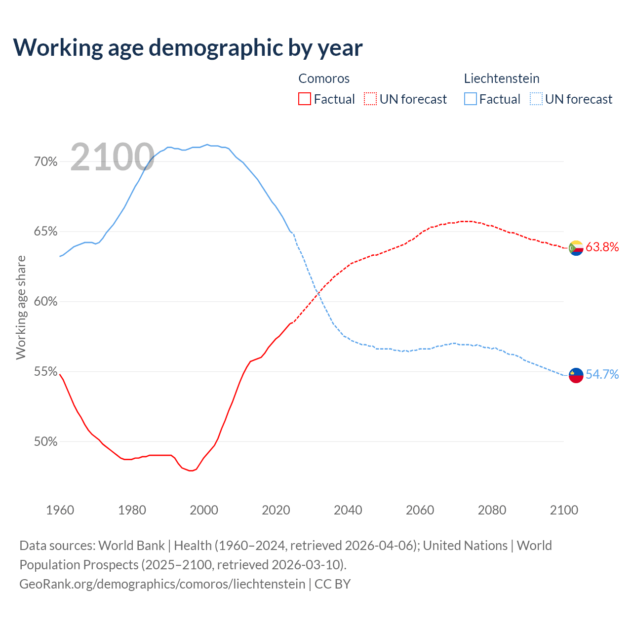 - Comoros has 528K working age adults (aged 15-64) vs 26.7K in Liechtenstein.