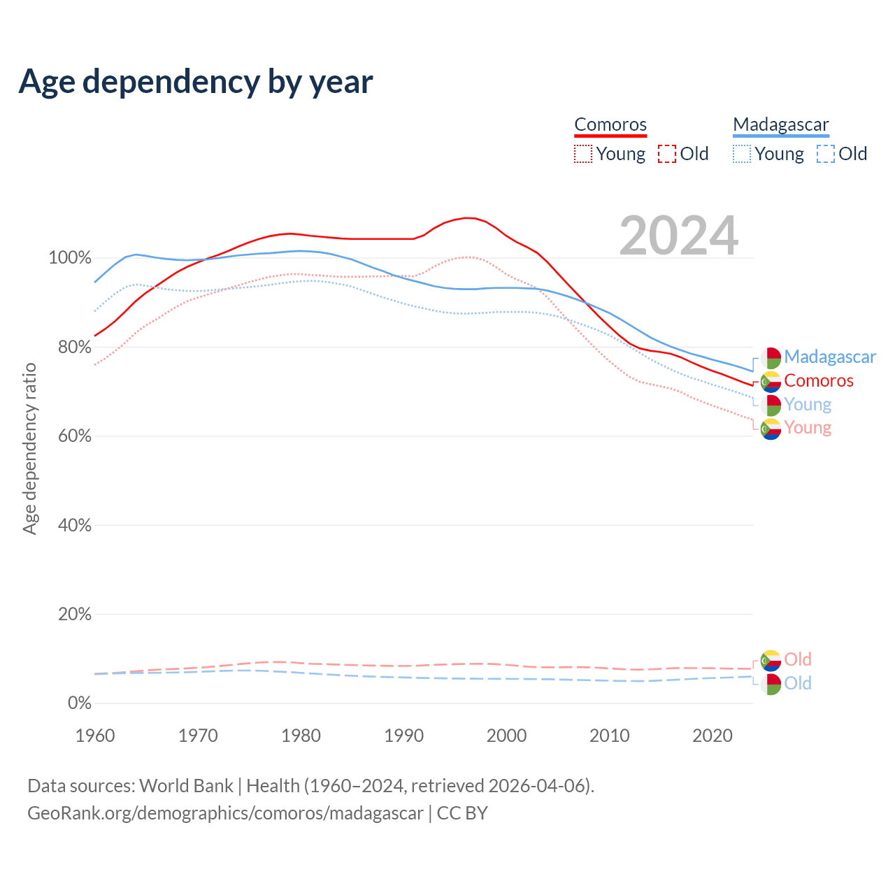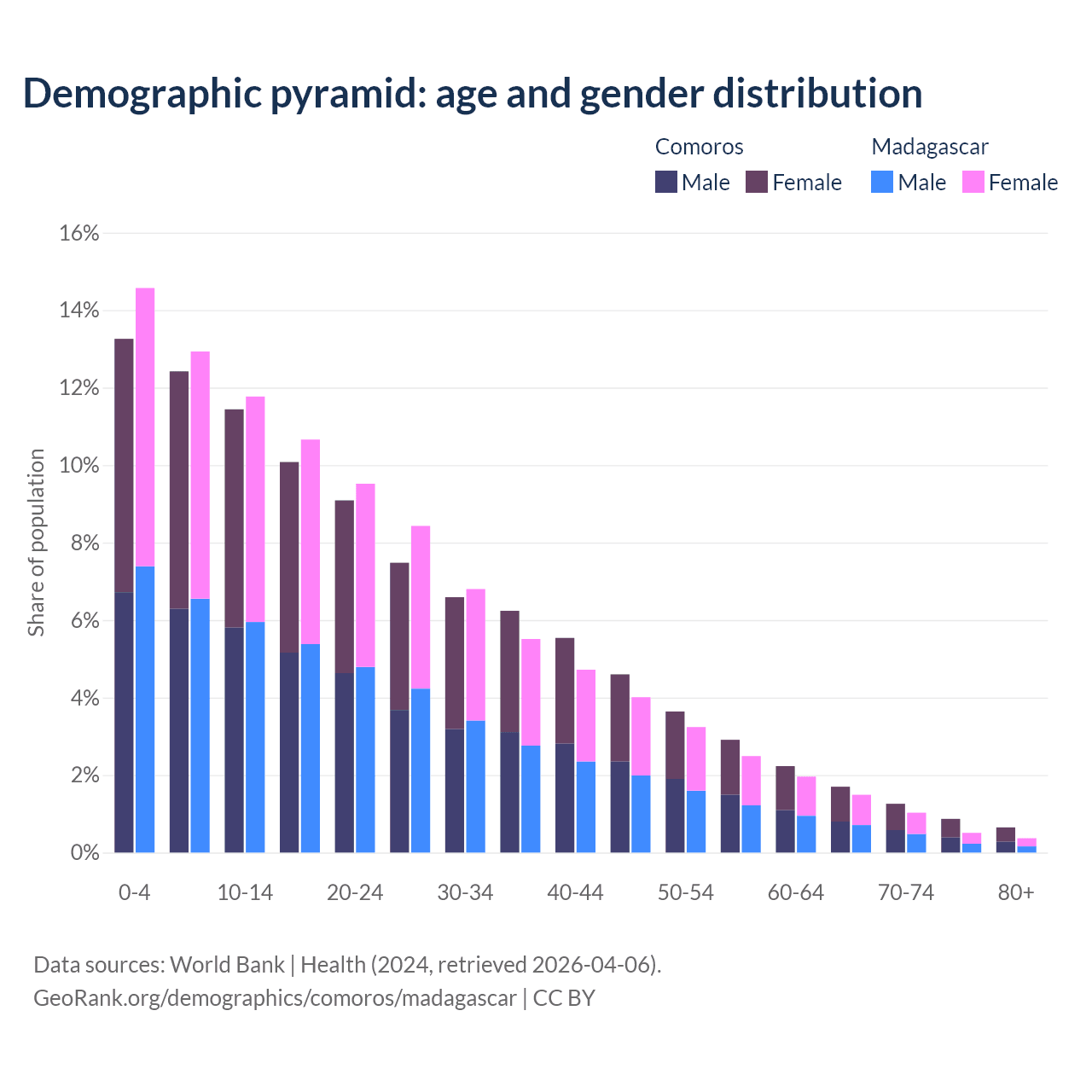 - The share of old-age demographic (65+) in Comoros is 4.47% vs 3.41% in Madagascar.