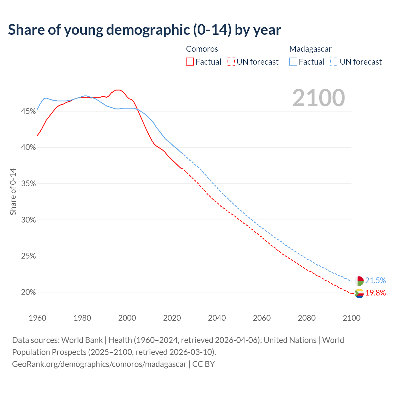 - The share of young demographic (0-15 years old) in Comoros is 37.1% vs 39.3% in Madagascar.