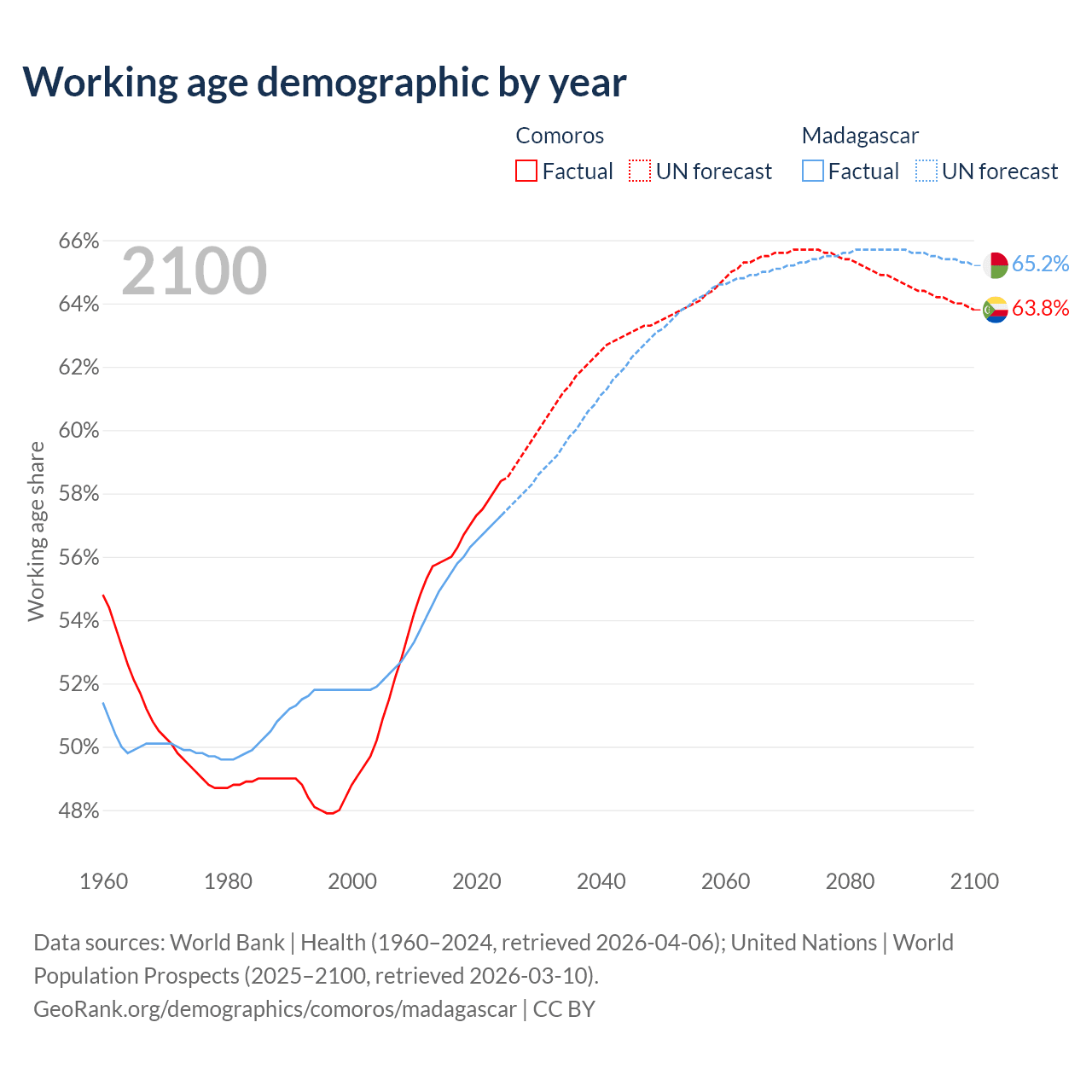 The share of older people aged 65 and over is 4.47% in Comoros and 3.41% in Madagascar. Life expectancy in Comoros compared to Madagascar .