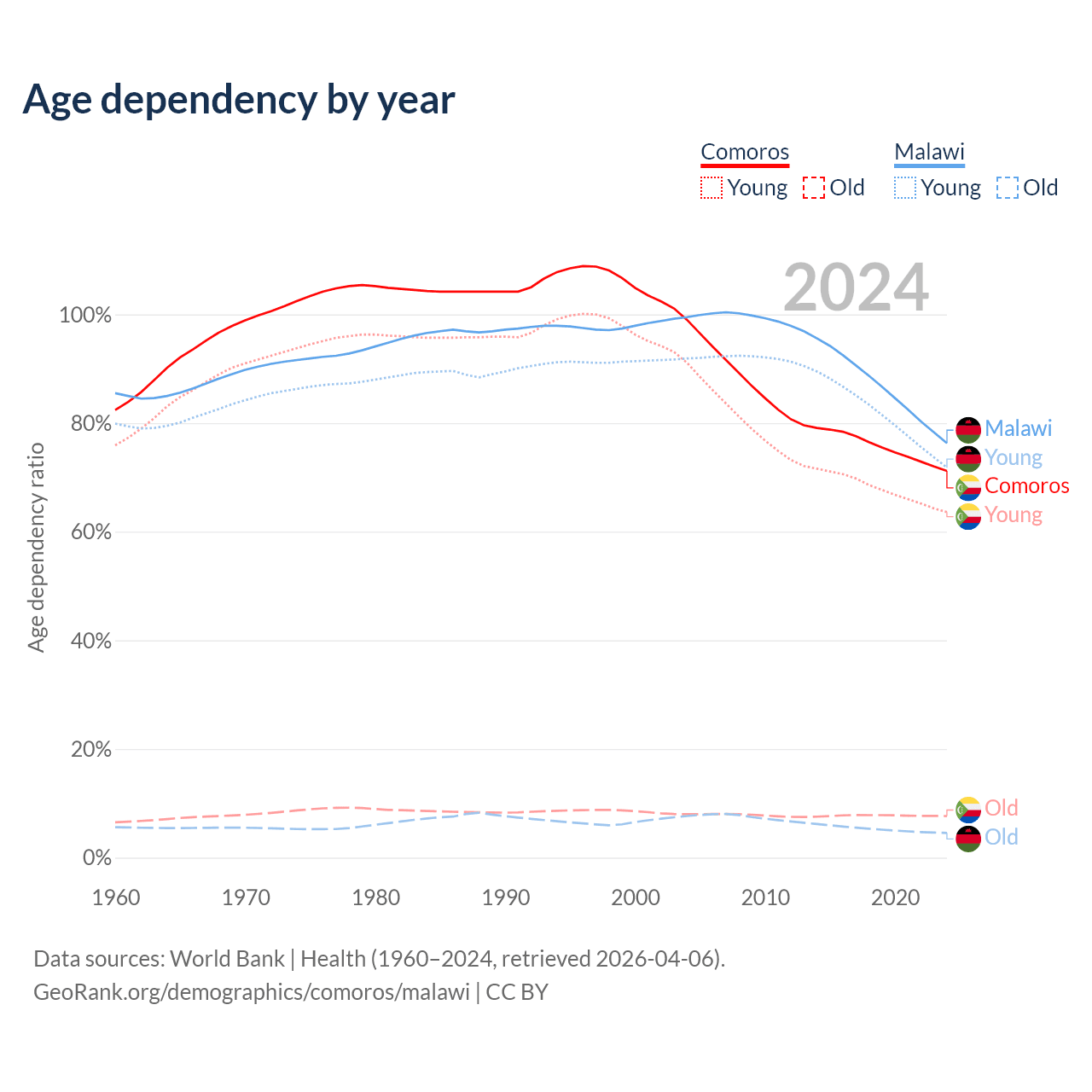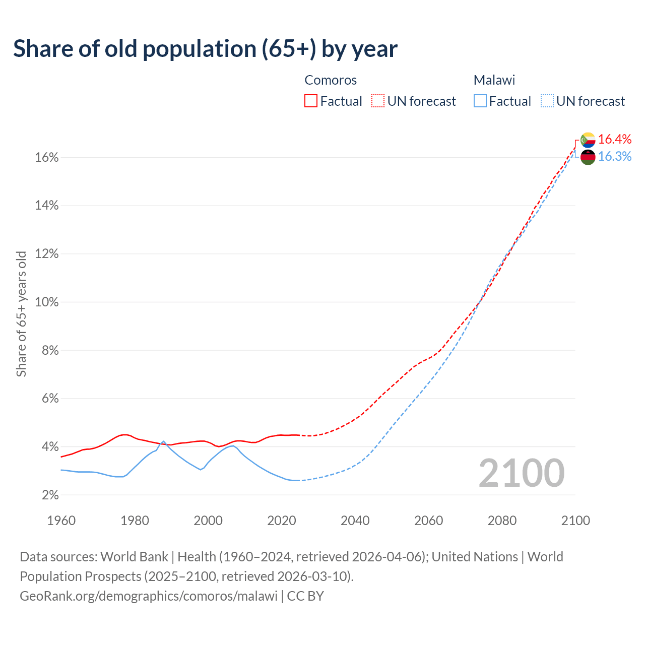 - The share of old-age demographic (65+) in Comoros is 4.47% vs 2.59% in Malawi.