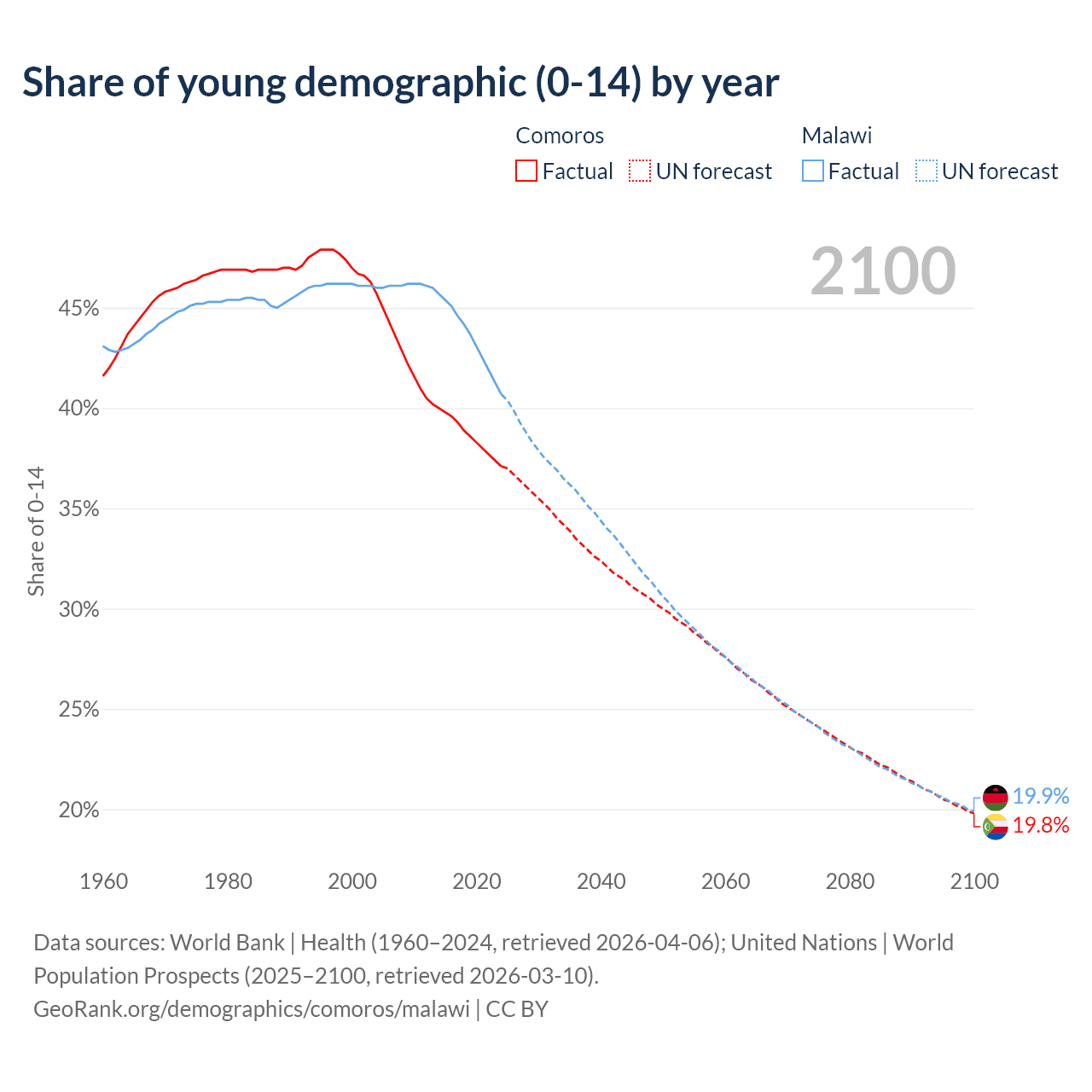 - The share of young demographic (0-15 years old) in Comoros is 37.1% vs 40.7% in Malawi.