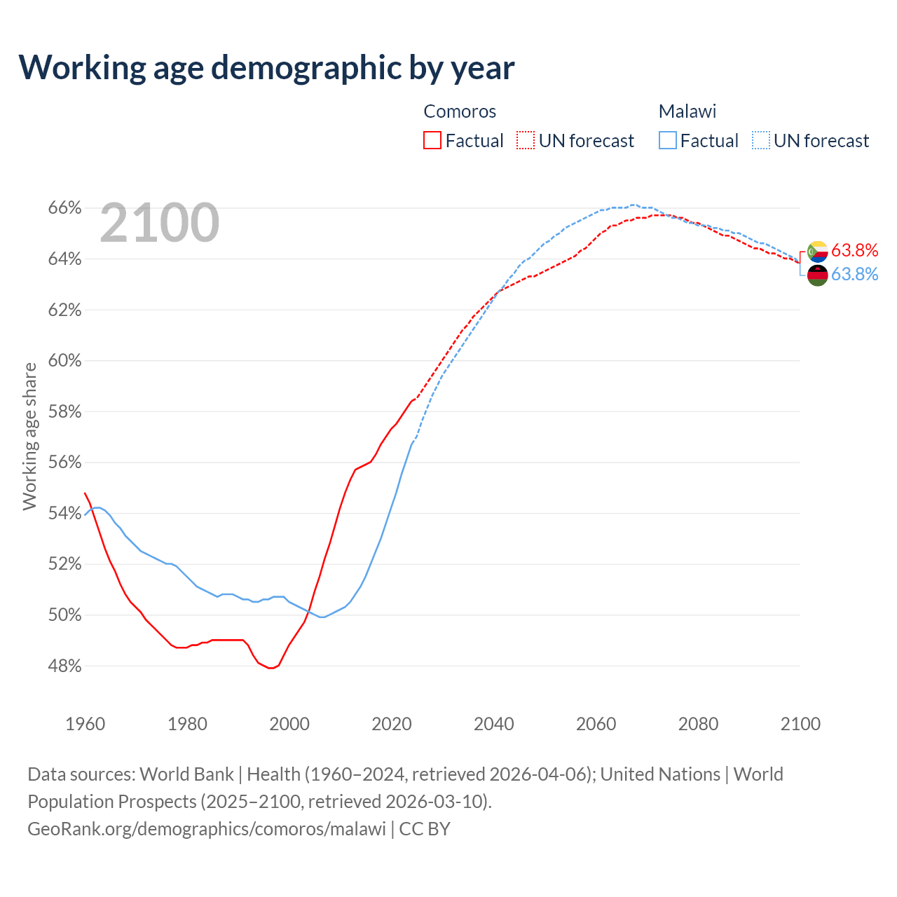 - Comoros has 528K working age adults (aged 15-64) vs 13M in Malawi.
