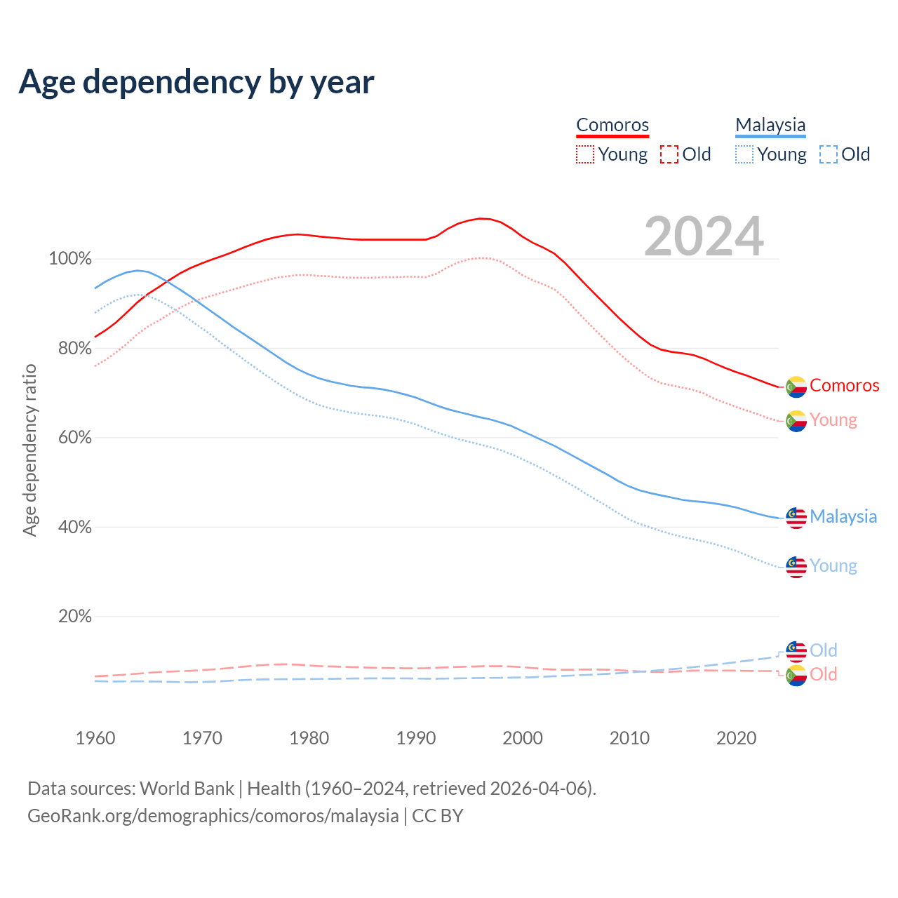 - Comoros is ranked 152/196 by median age (oldest to youngest) vs 92/196 for Malaysia.