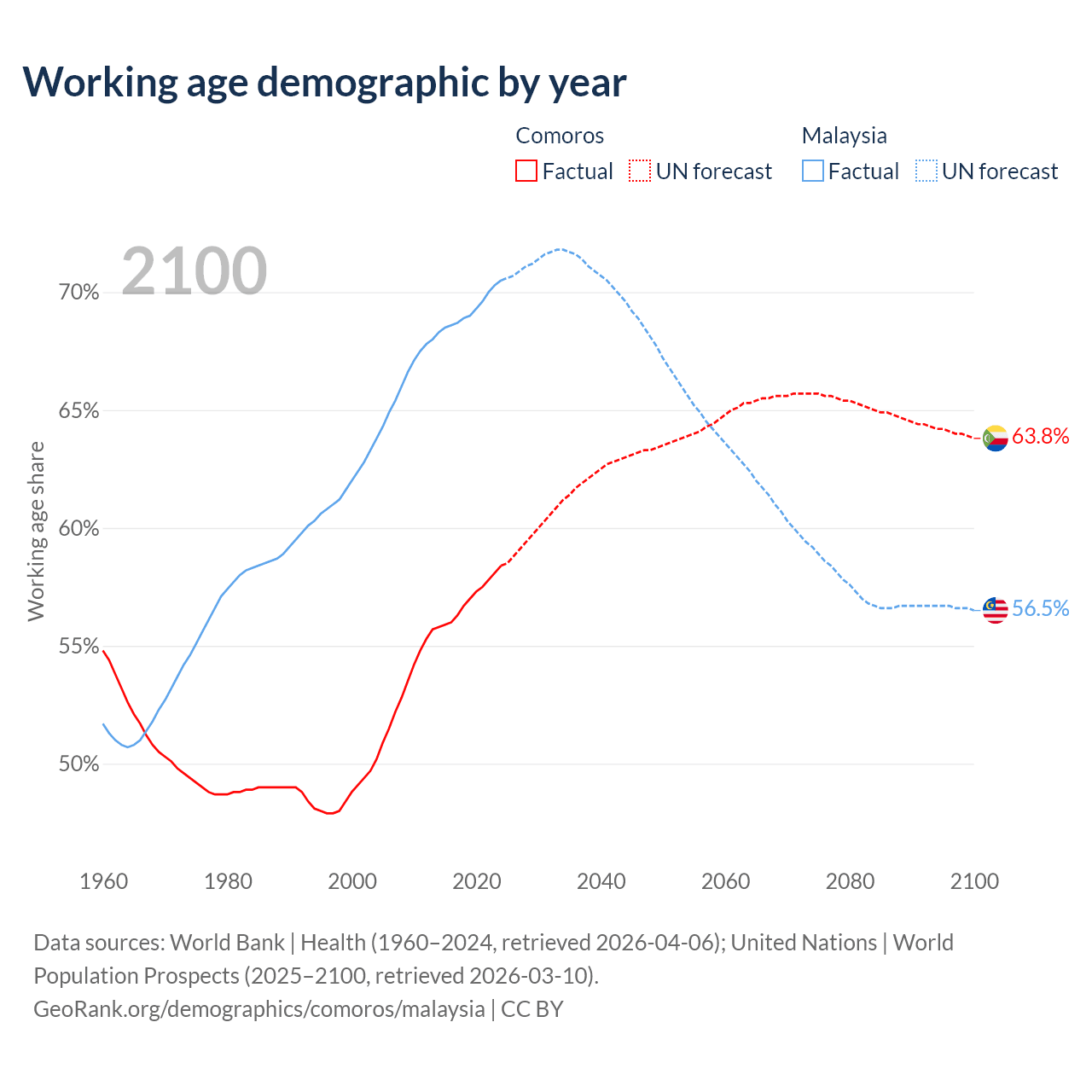 - Comoros has 528K working age adults (aged 15-64) vs 25.7M in Malaysia.