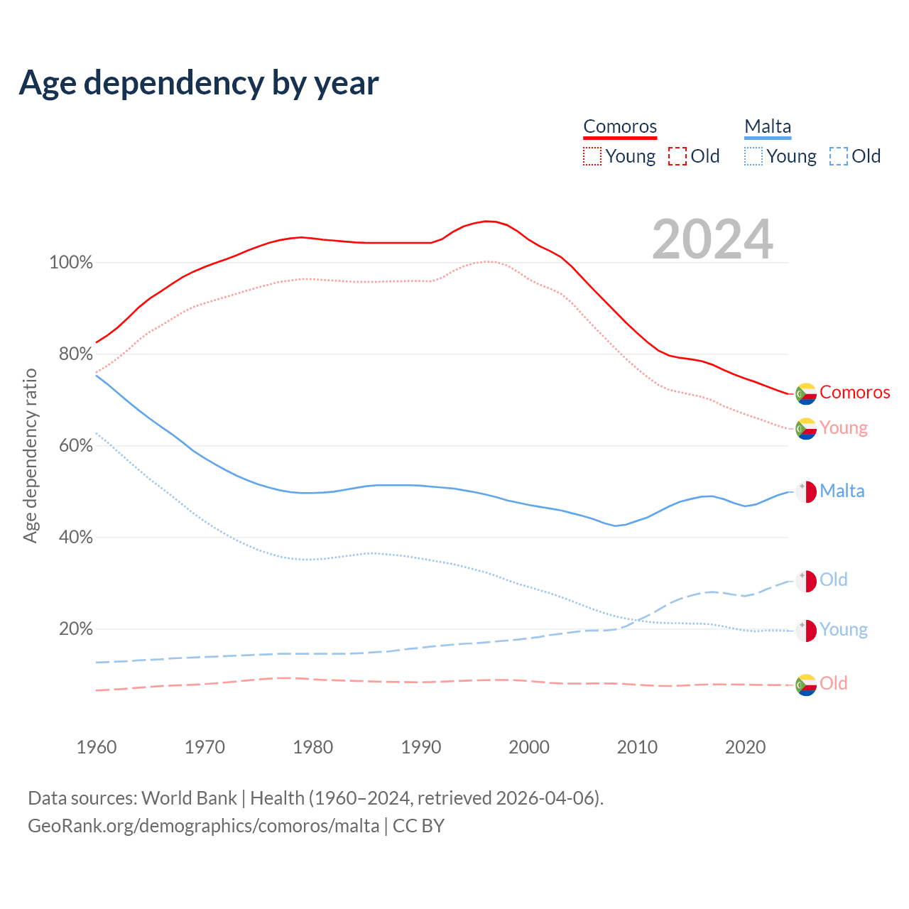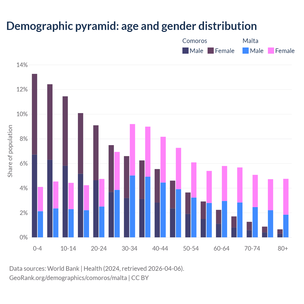 - The share of old-age demographic (65+) in Comoros is 4.47% vs 20.2% in Malta.