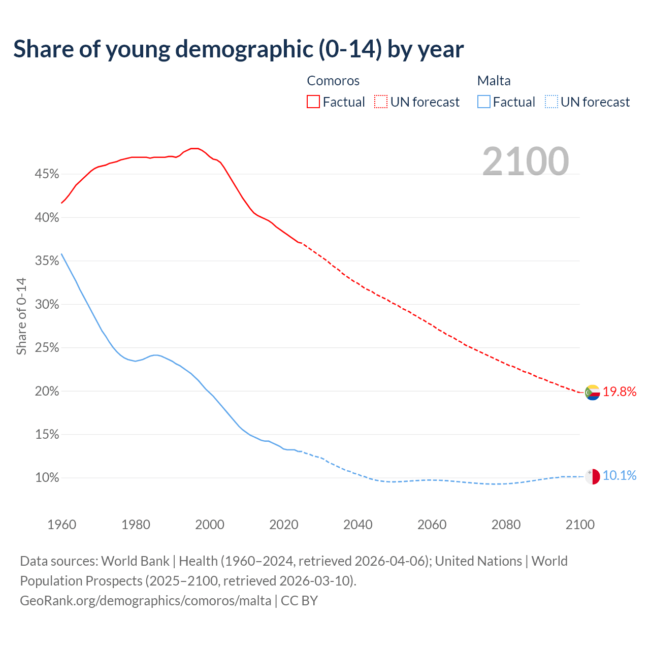 - The share of young demographic (0-15 years old) in Comoros is 37.1% vs 13% in Malta.