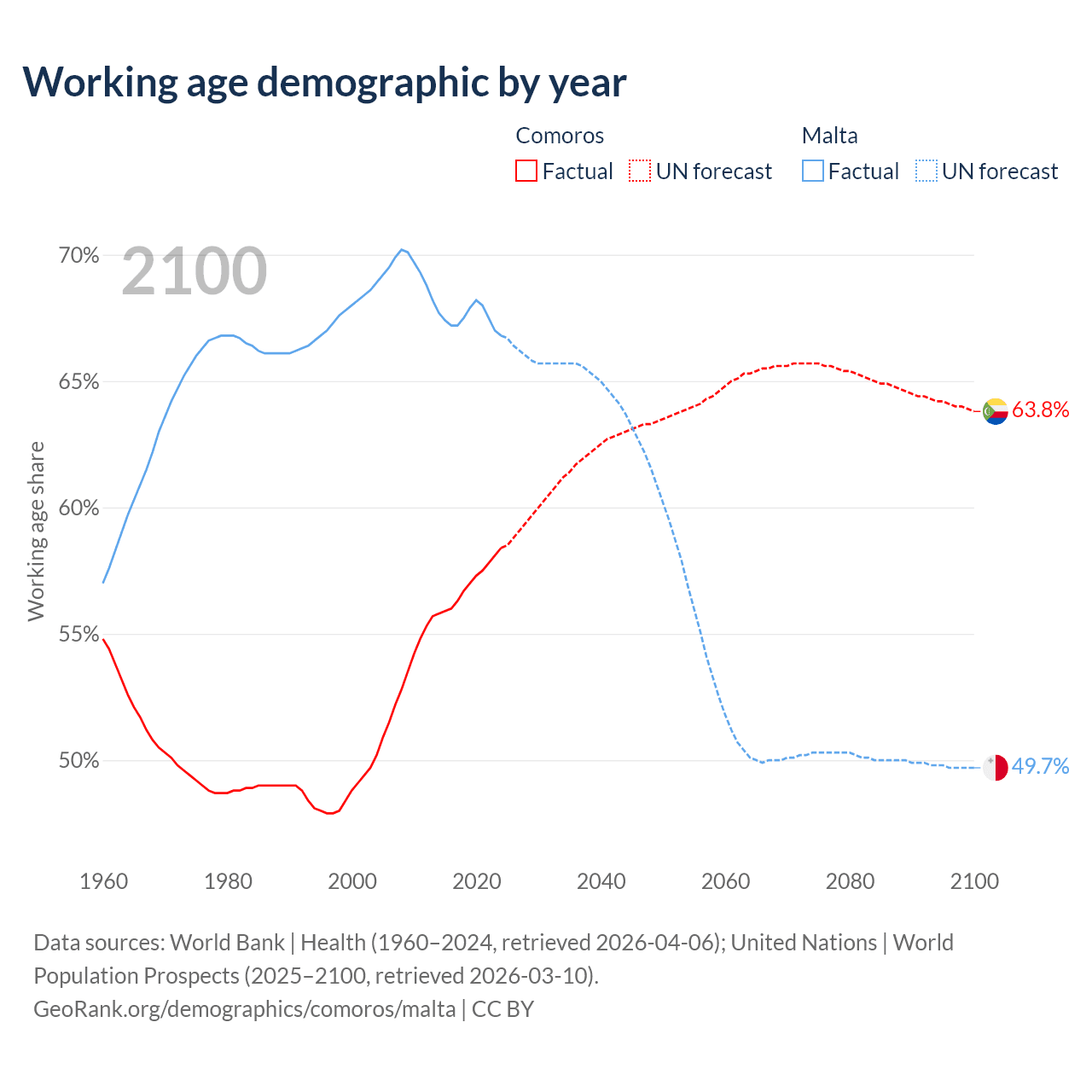 - Comoros has 528K working age adults (aged 15-64) vs 388K in Malta.