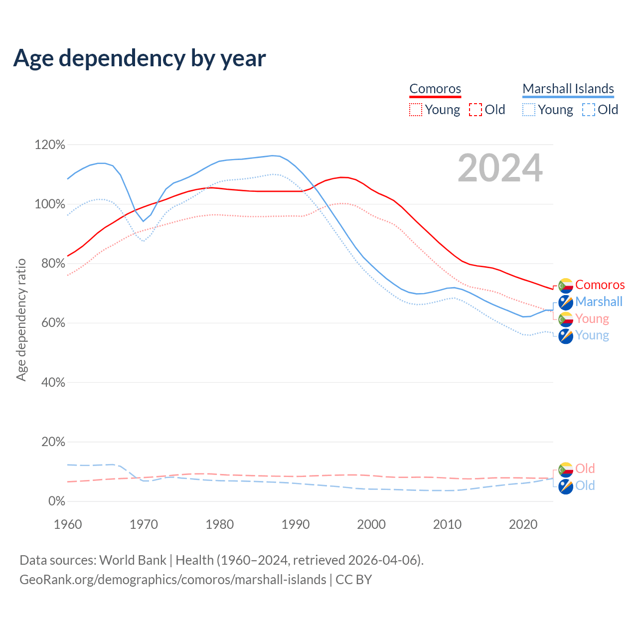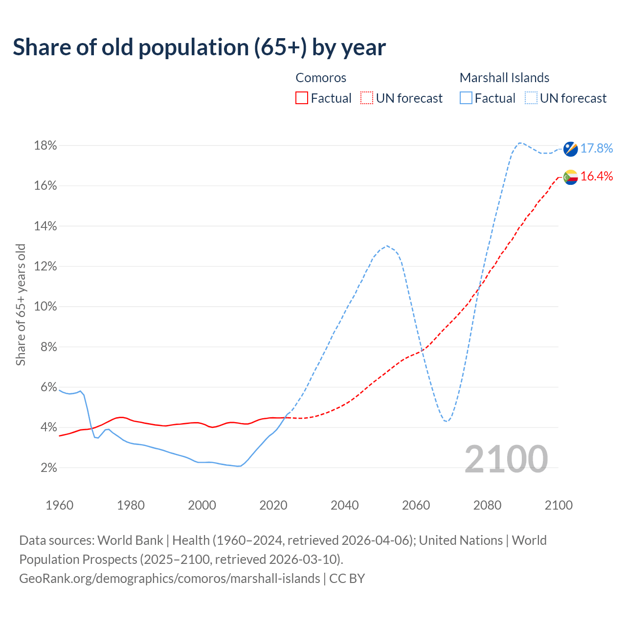- The share of old-age demographic (65+) in Comoros is 4.47% vs 4.64% in the Marshall Islands.