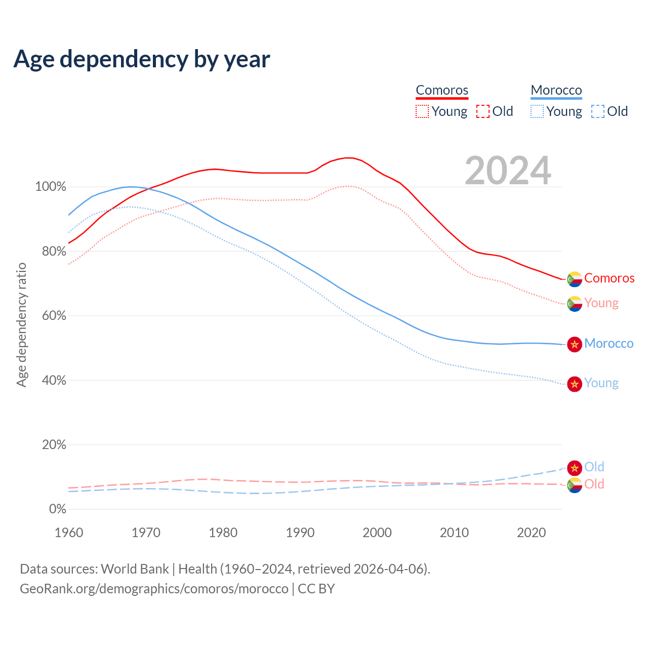 - Comoros is ranked 152/196 by median age (oldest to youngest) vs 100/196 for Morocco.
