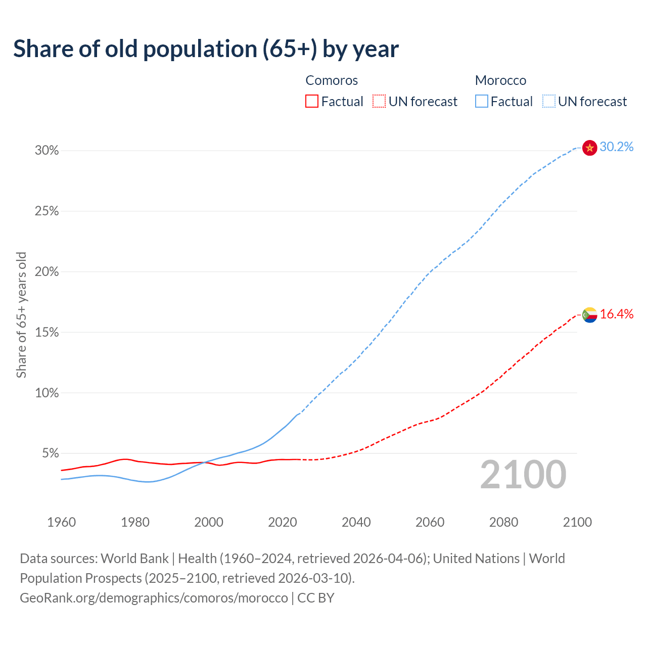 - The share of old-age demographic (65+) in Comoros is 4.47% vs 8.14% in Morocco.