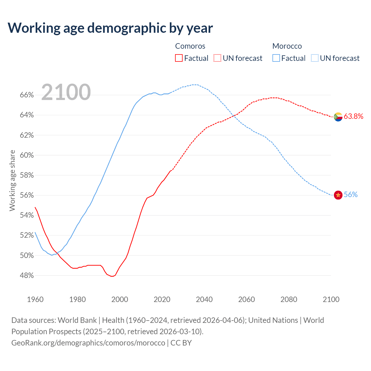 - Comoros has 528K working age adults (aged 15-64) vs 25.7M in Morocco.