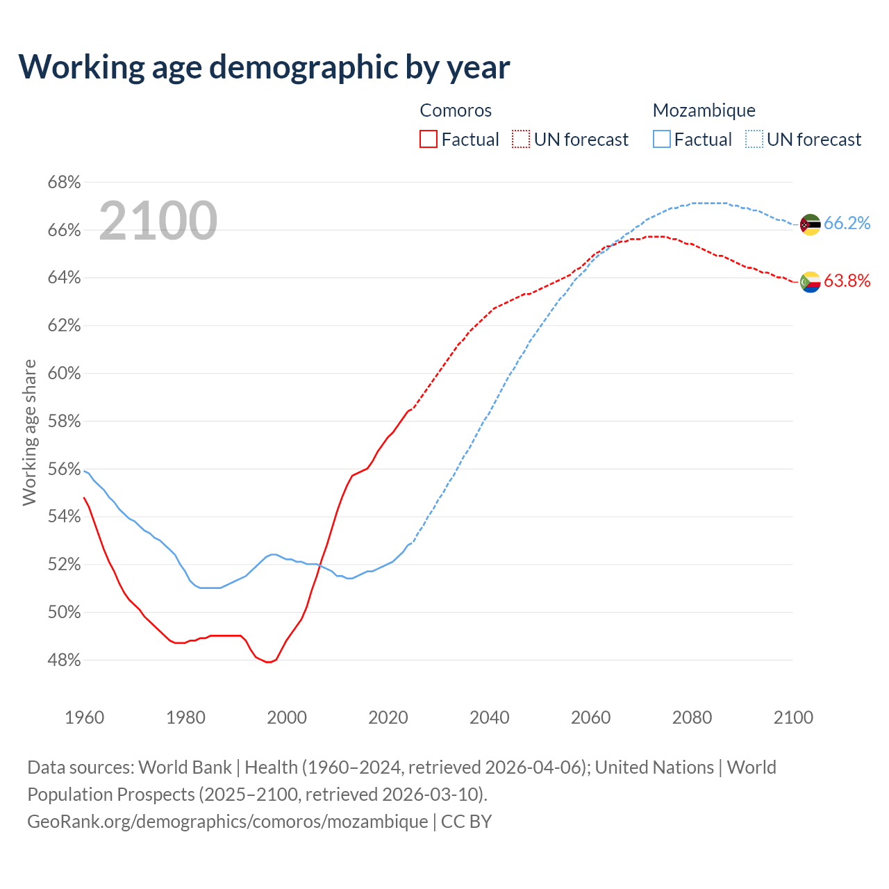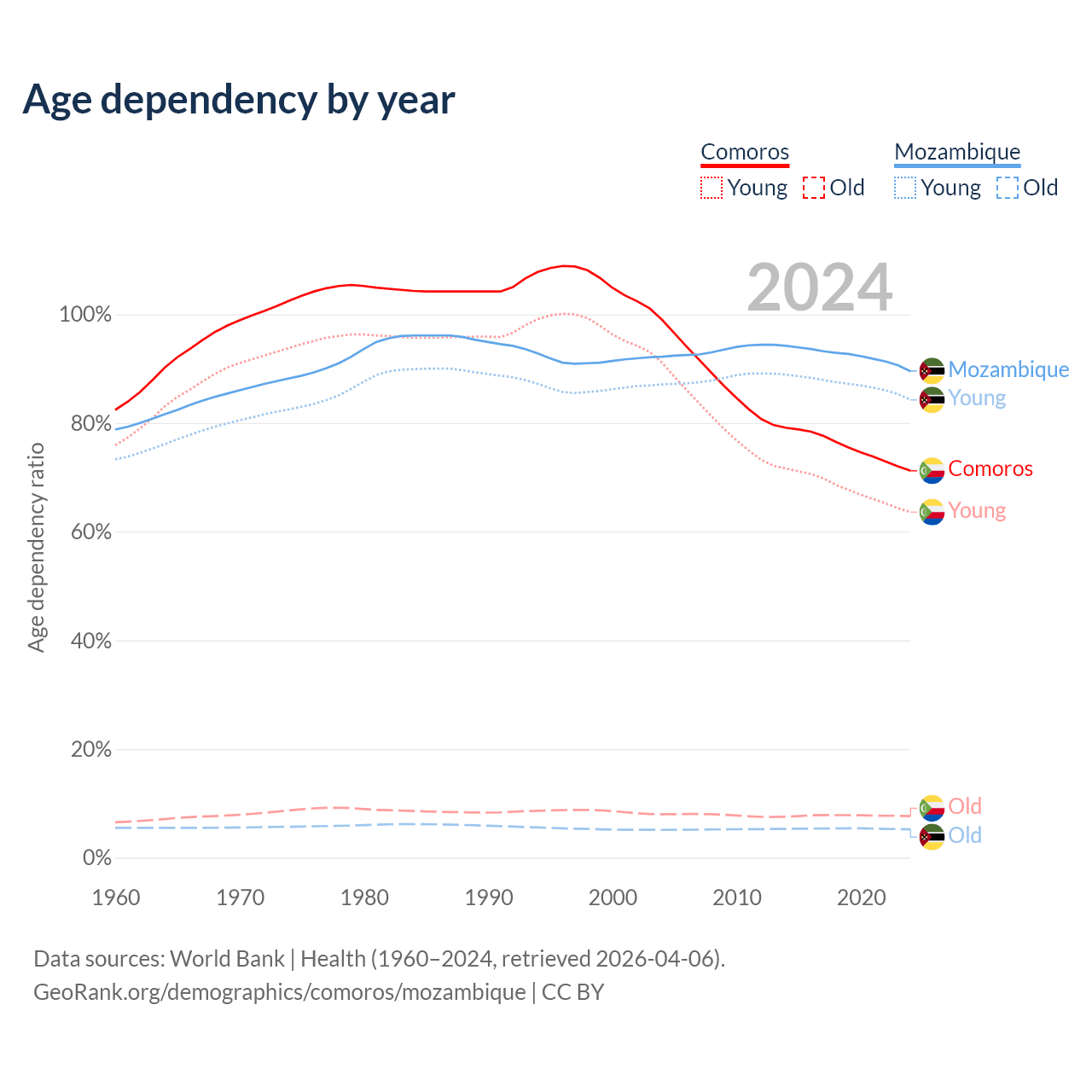 - The share of old-age demographic (65+) in Comoros is 4.47% vs 2.75% in Mozambique.