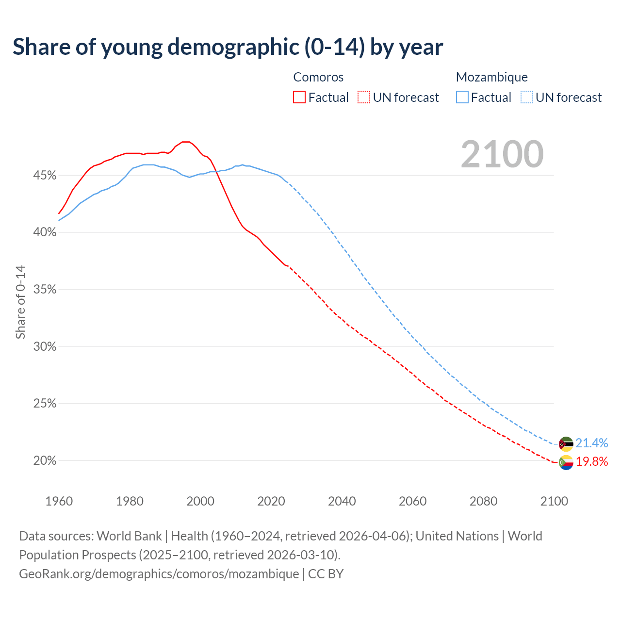 - The share of young demographic (0-15 years old) in Comoros is 37.1% vs 44.5% in Mozambique.
