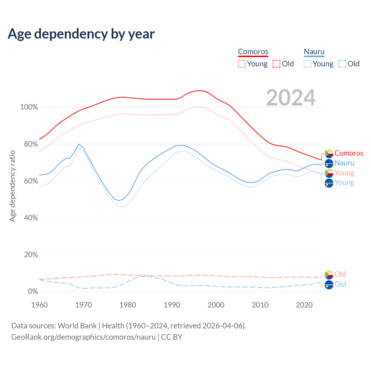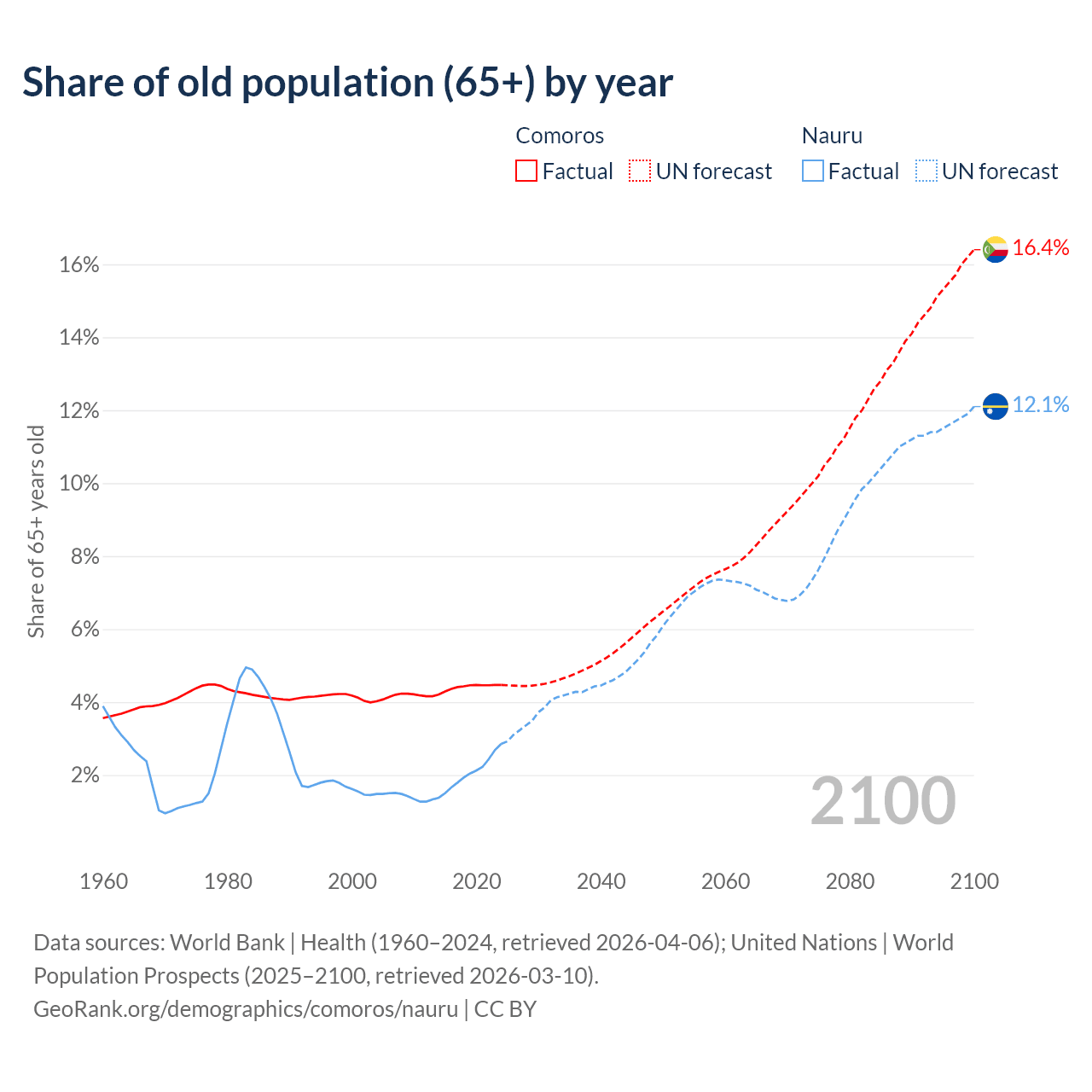 - The share of old-age demographic (65+) in Comoros is 4.47% vs 2.85% in Nauru.