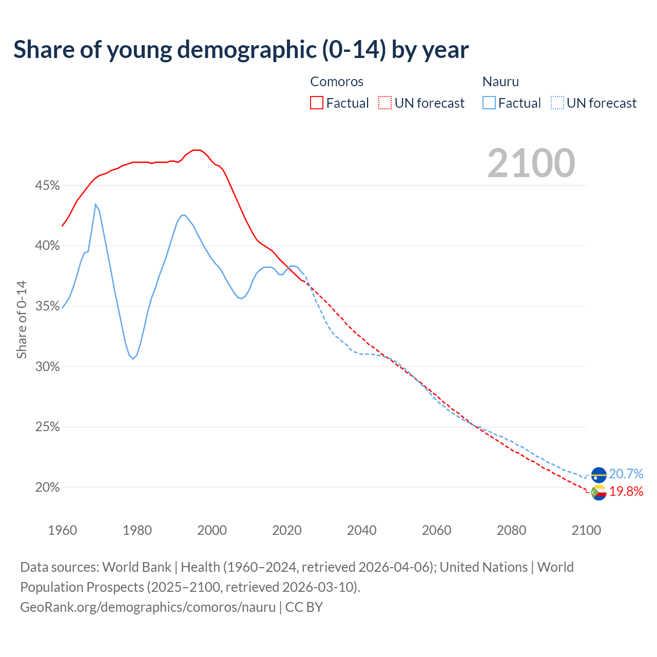 - The share of young demographic (0-15 years old) in Comoros is 37.1% vs 37.8% in Nauru.