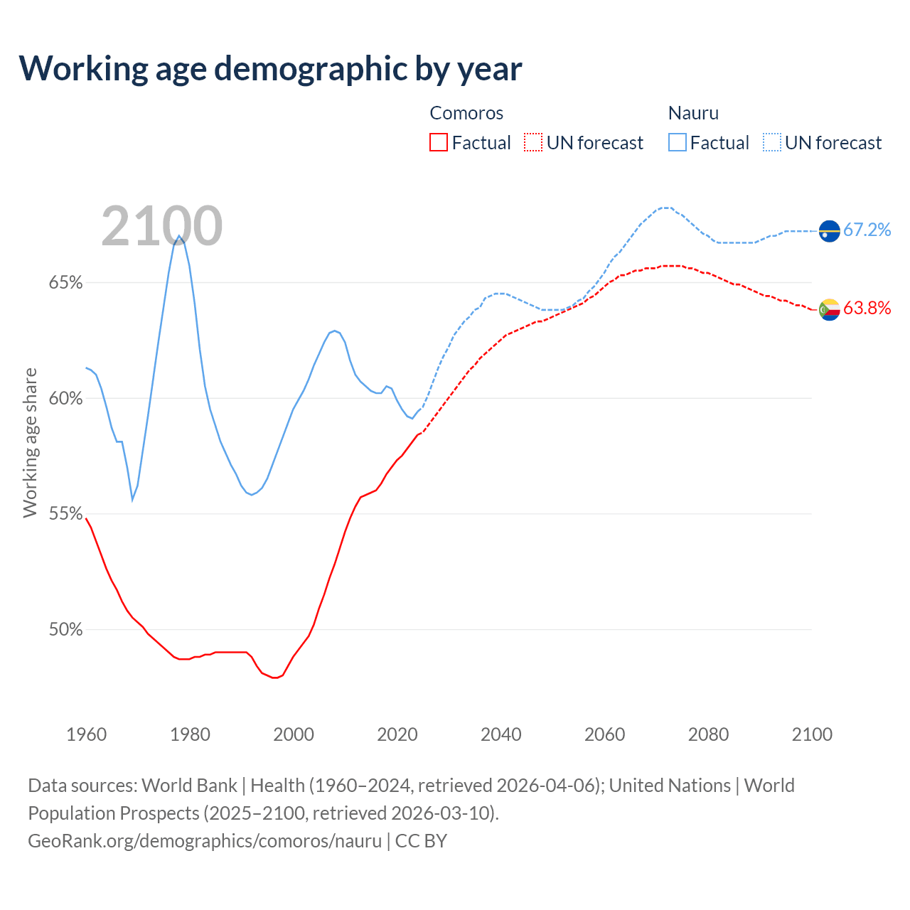 - Comoros has 528K working age adults (aged 15-64) vs 7.2K in Nauru.