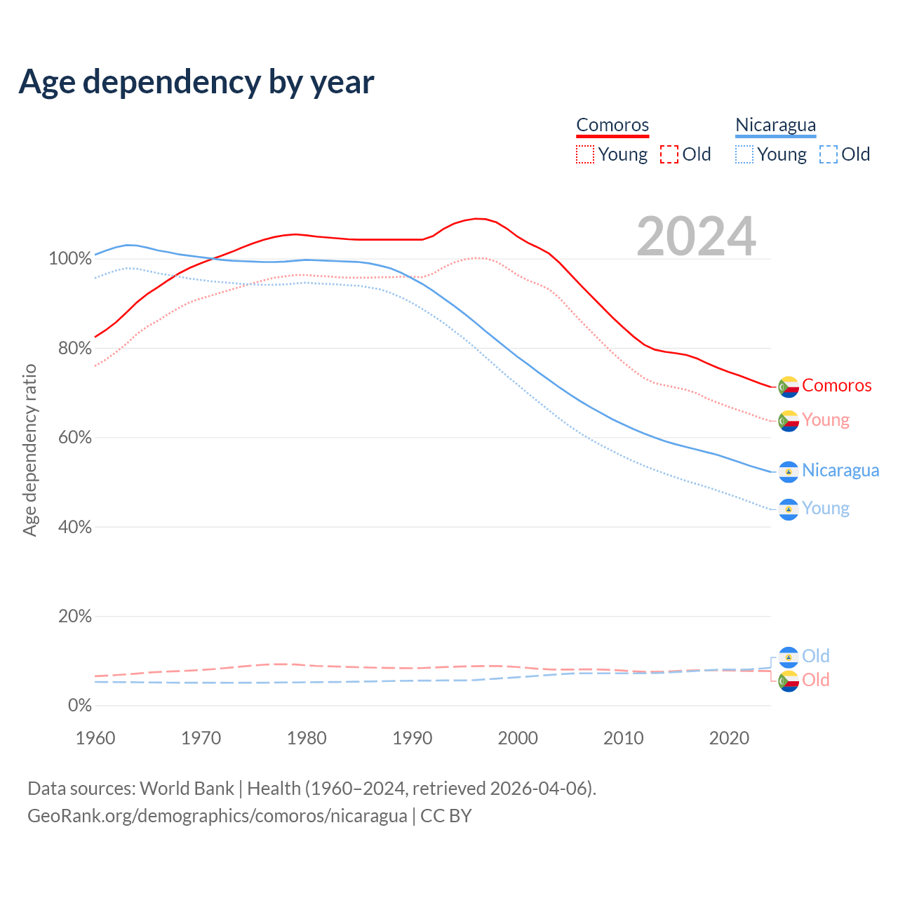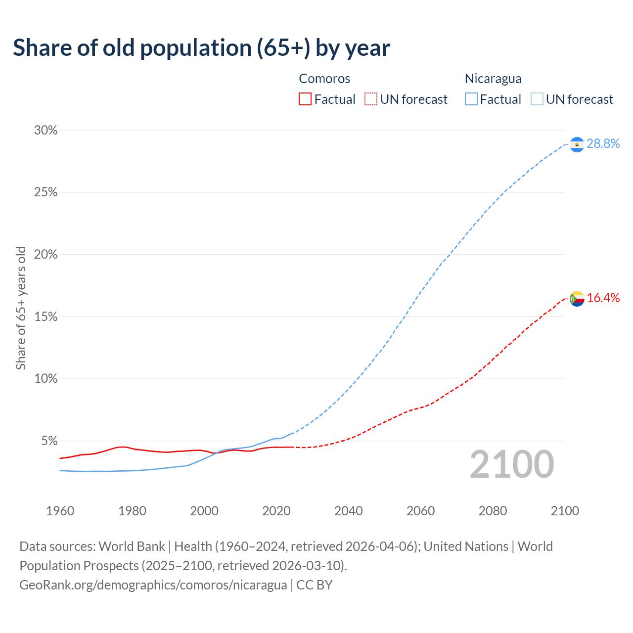 - The share of old-age demographic (65+) in Comoros is 4.47% vs 5.53% in Nicaragua.