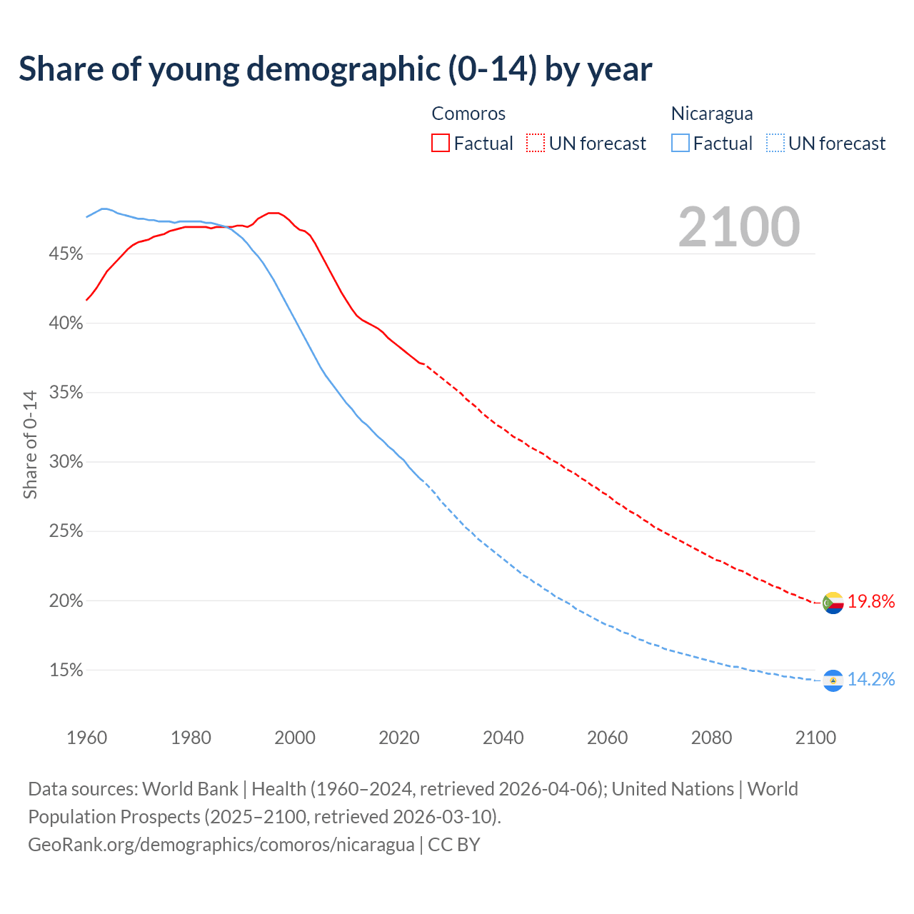 - The share of young demographic (0-15 years old) in Comoros is 37.1% vs 28.8% in Nicaragua.