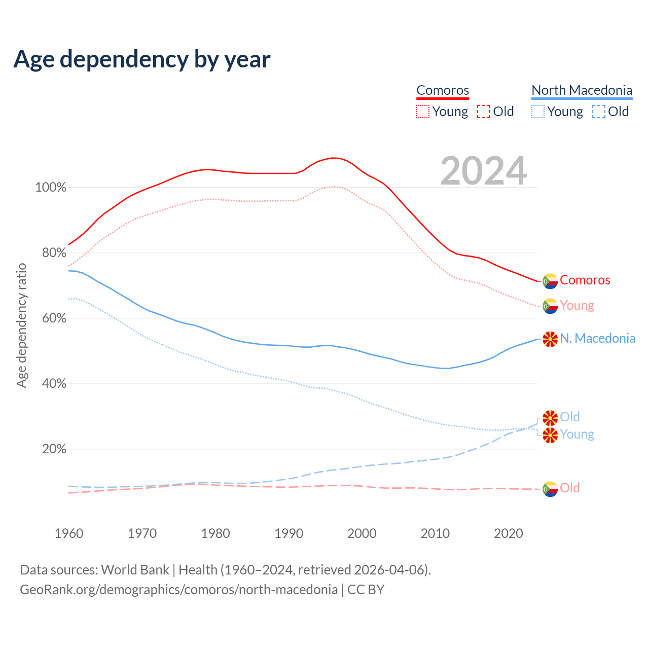 - Comoros is ranked 152/196 by median age (oldest to youngest) vs 37/196 for North Macedonia.