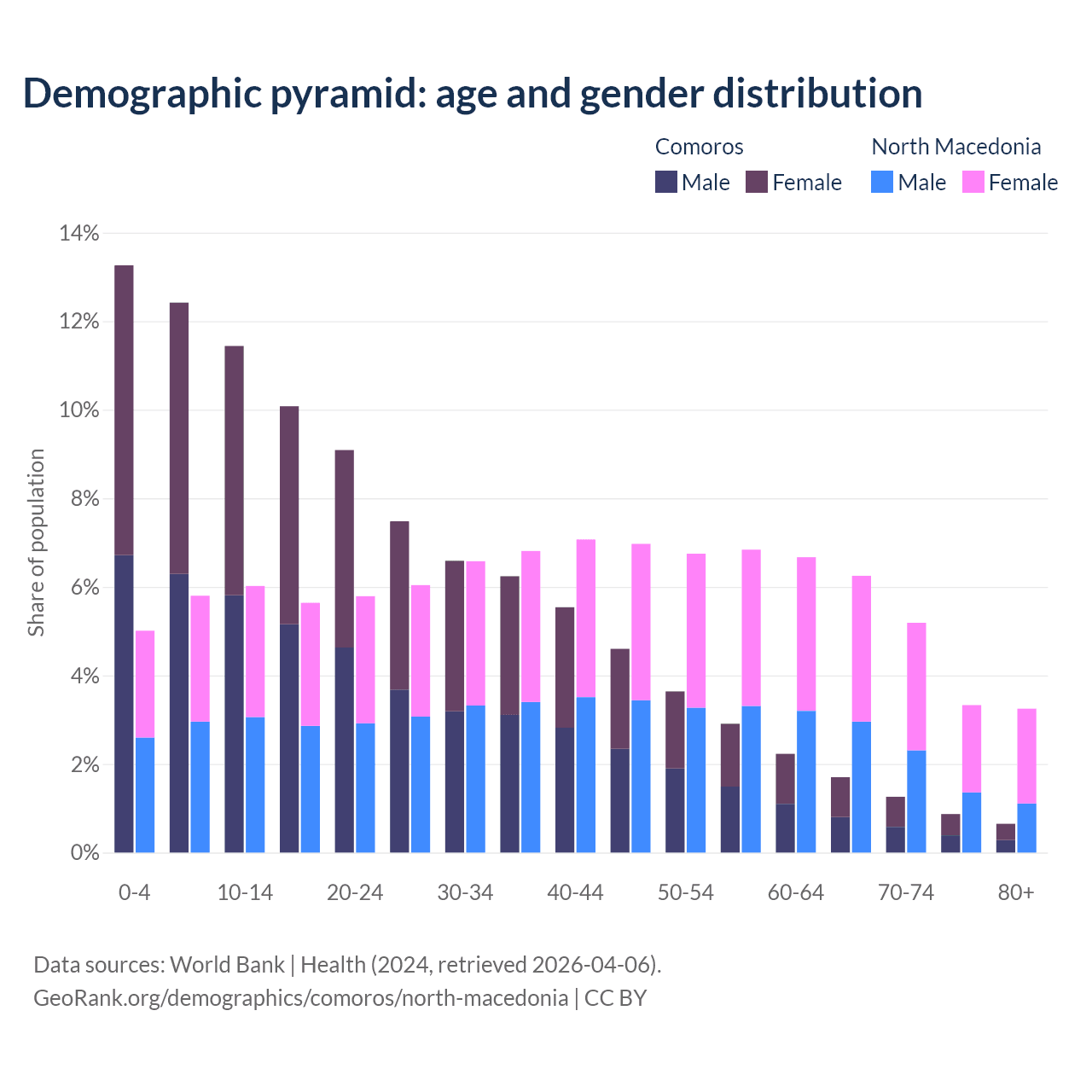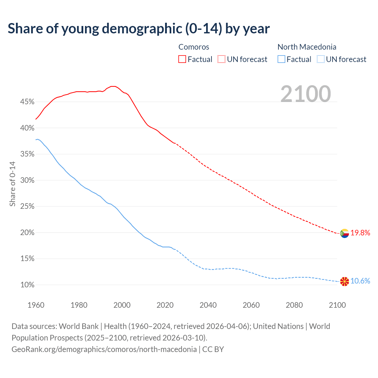 - The share of young demographic (0-15 years old) in Comoros is 37.1% vs 16.8% in North Macedonia.