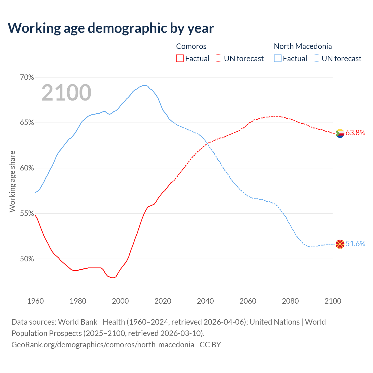Median age Comoros vs North Macedonia, 1960-2100