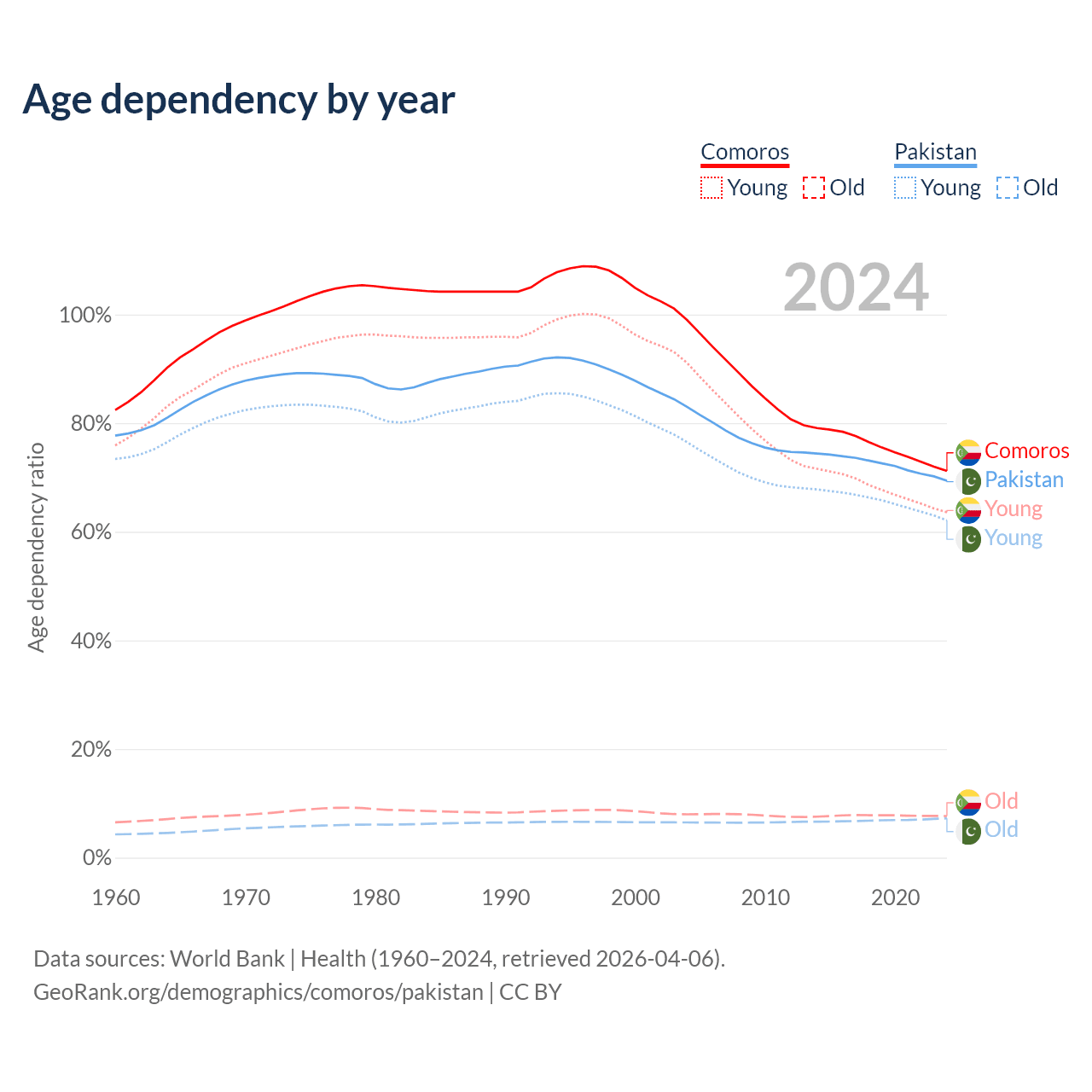 - The share of old-age demographic (65+) in Comoros is 4.47% vs 4.28% in Pakistan.