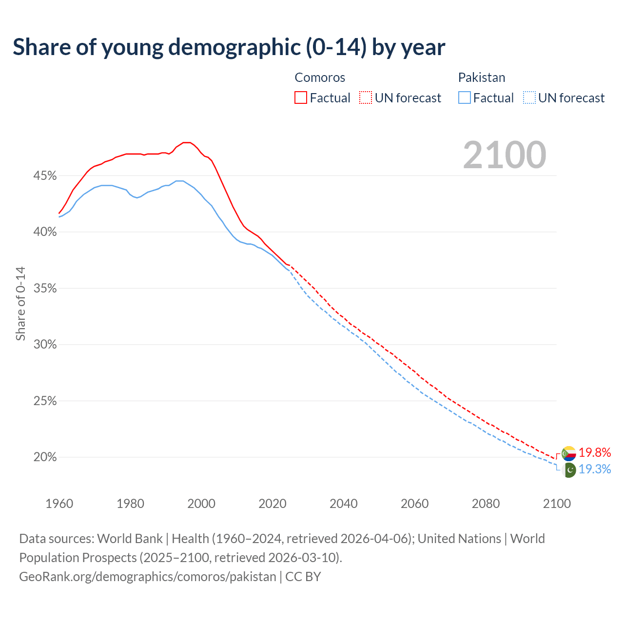 - The share of young demographic (0-15 years old) in Comoros is 37.1% vs 36.7% in Pakistan.
