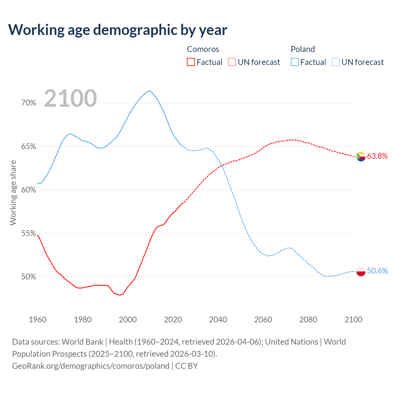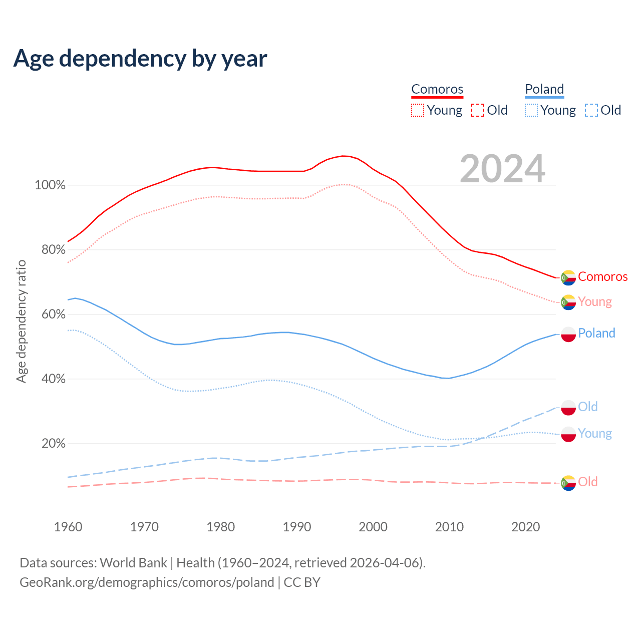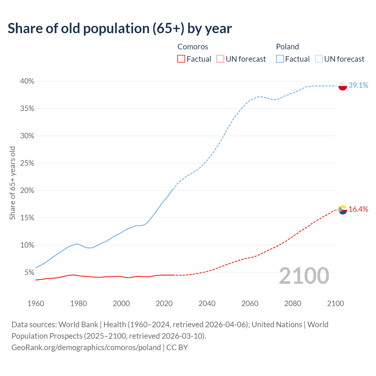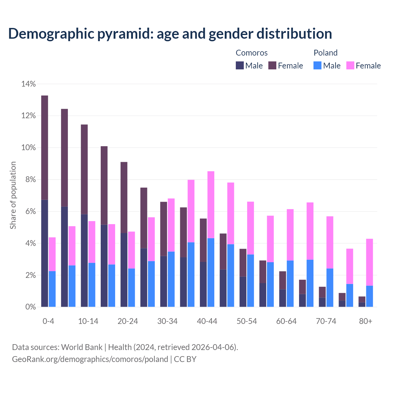 - The share of old-age demographic (65+) in Comoros is 4.47% vs 20.1% in Poland.