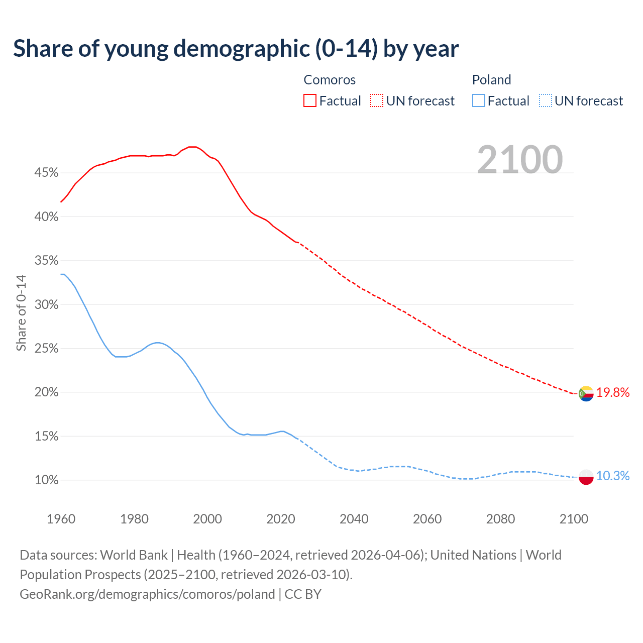 - The share of young demographic (0-15 years old) in Comoros is 37.1% vs 14.8% in Poland.