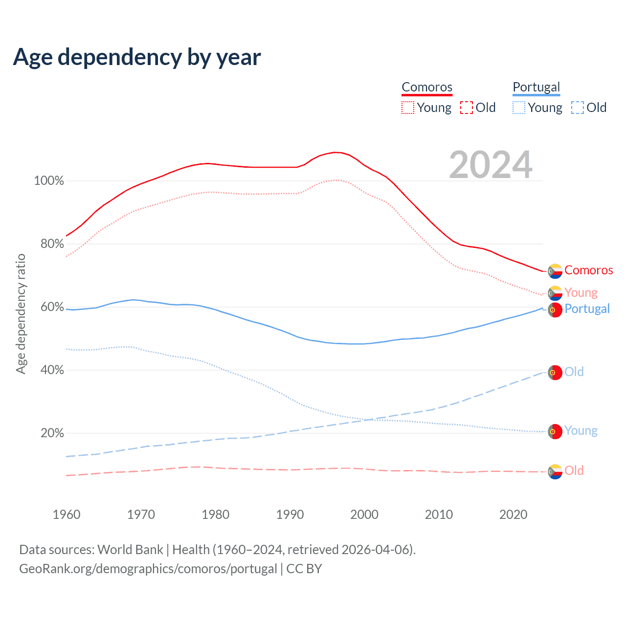 - The share of old-age demographic (65+) in Comoros is 4.47% vs 24.5% in Portugal.