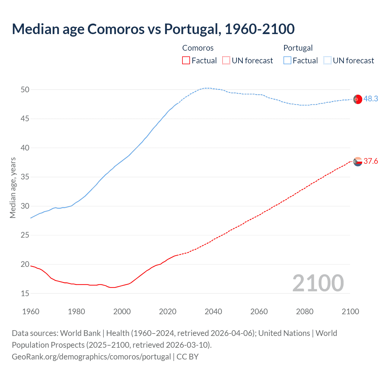 Median age Comoros vs Portugal, 1960-2100