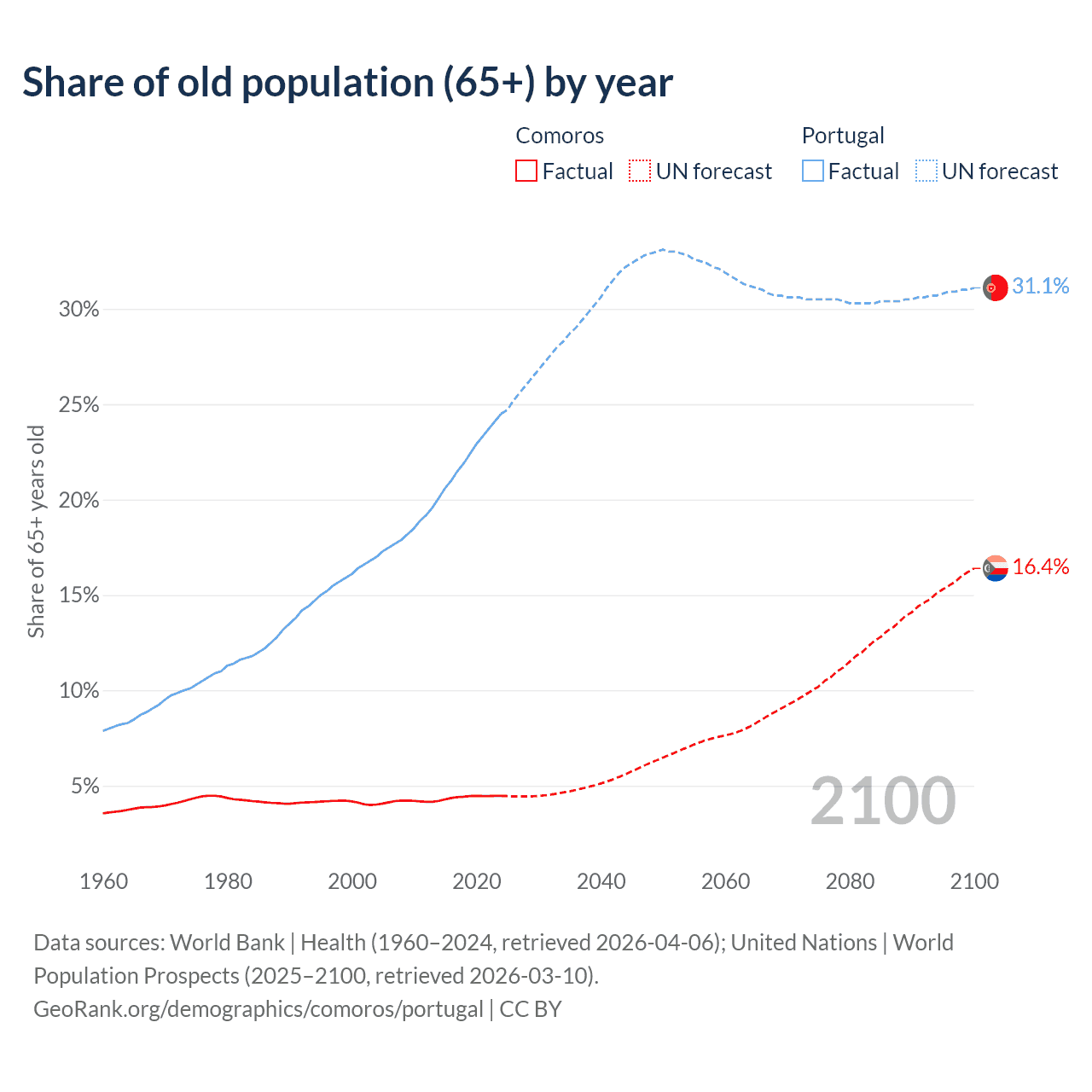The share of older people aged 65 and over is 4.47% in Comoros and 24.5% in Portugal. Life expectancy in Comoros compared to Portugal .
