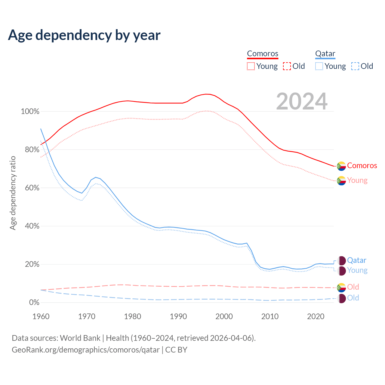 - Comoros is ranked 152/196 by median age (oldest to youngest) vs 78/196 for Qatar.