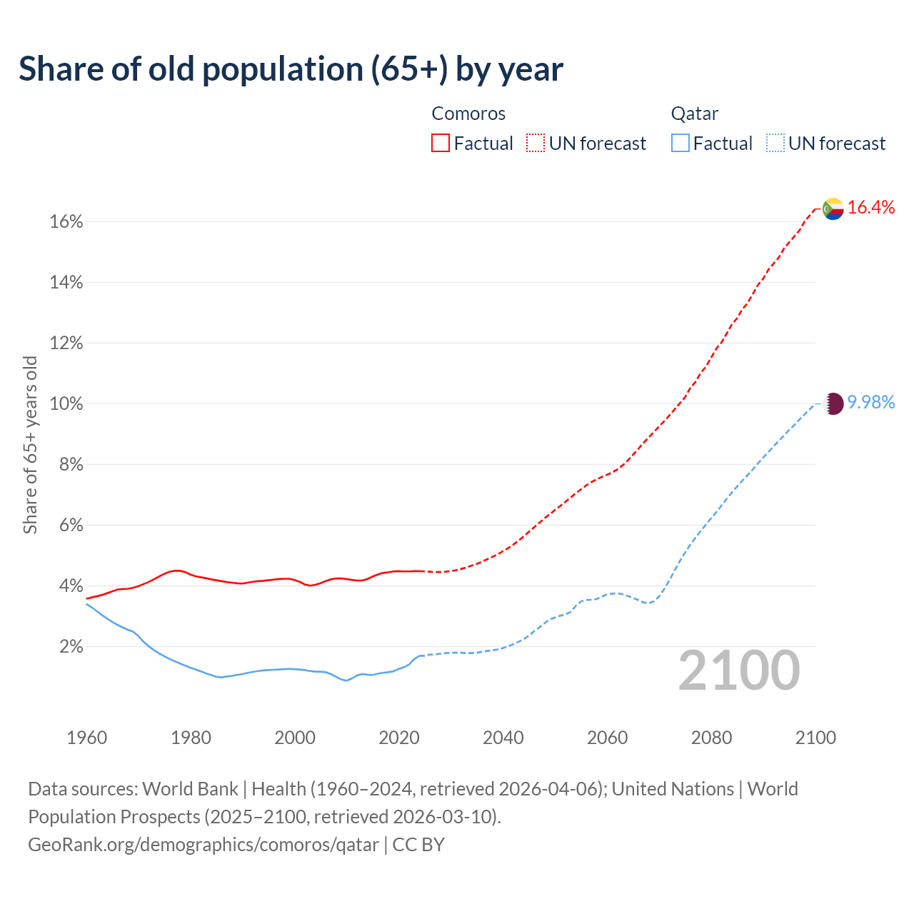 - The share of old-age demographic (65+) in Comoros is 4.47% vs 1.68% in Qatar.