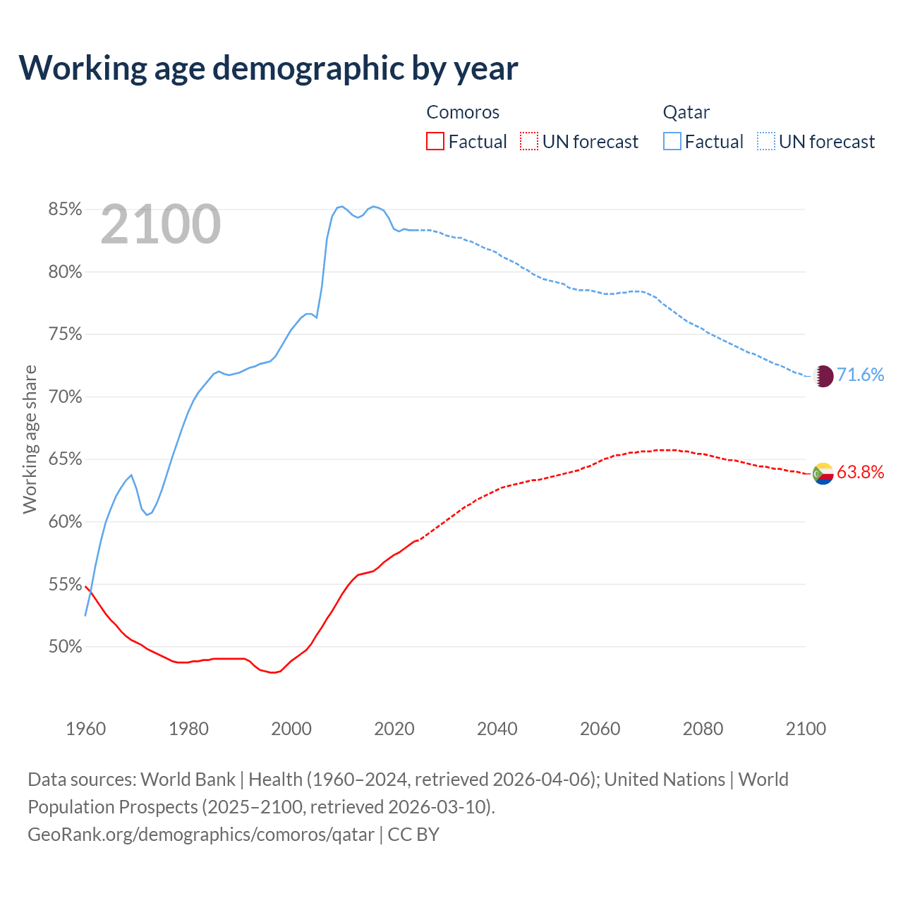 - Comoros has 528K working age adults (aged 15-64) vs 2.5M in Qatar.