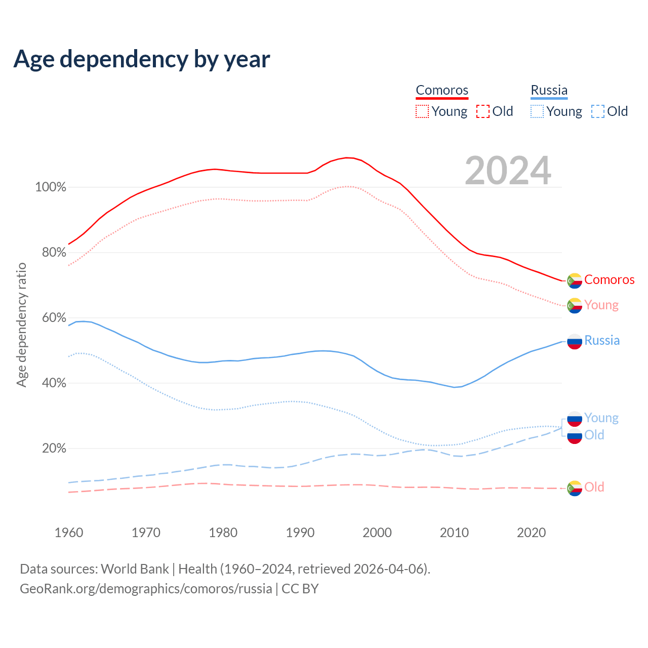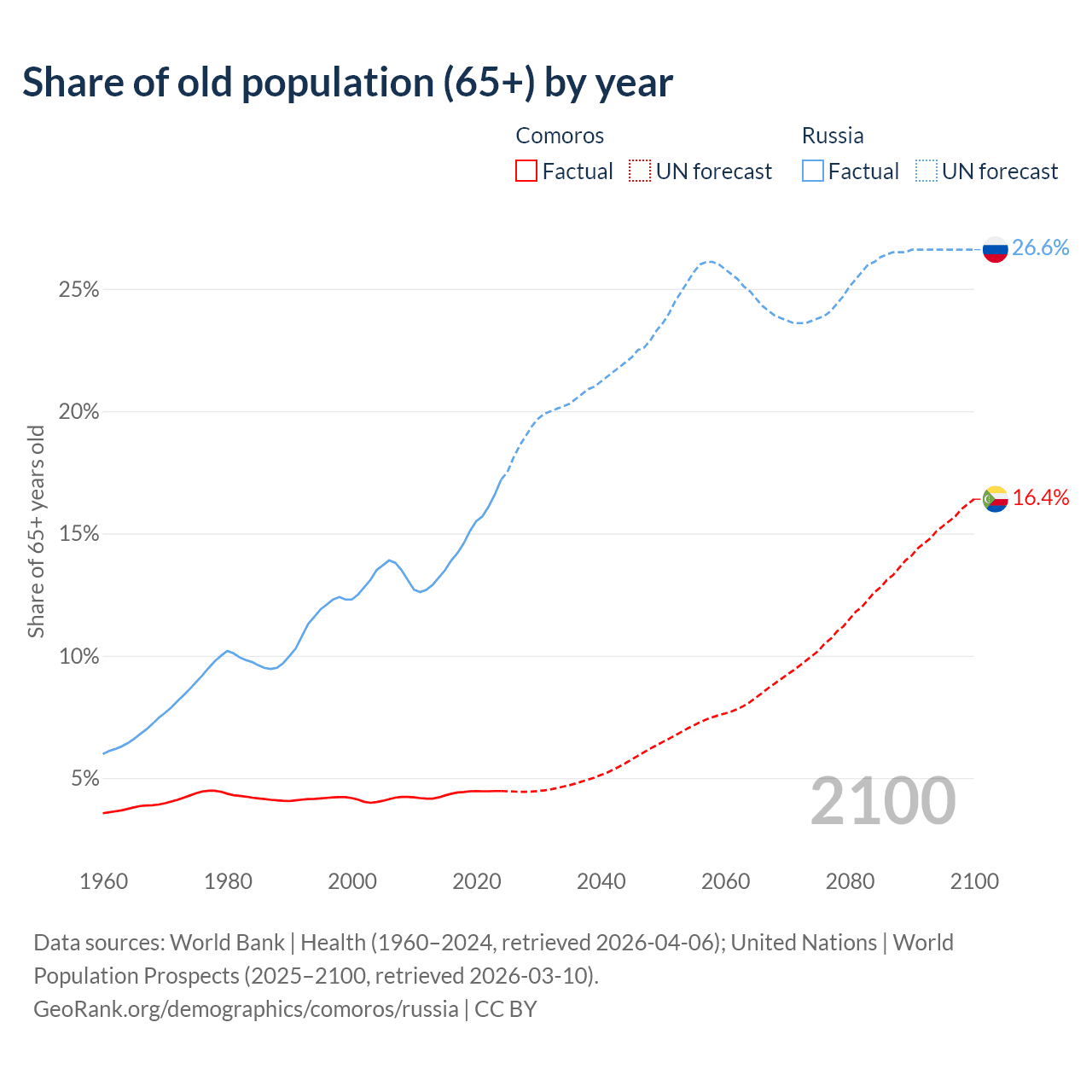 - The share of old-age demographic (65+) in Comoros is 4.47% vs 17.2% in Russia.