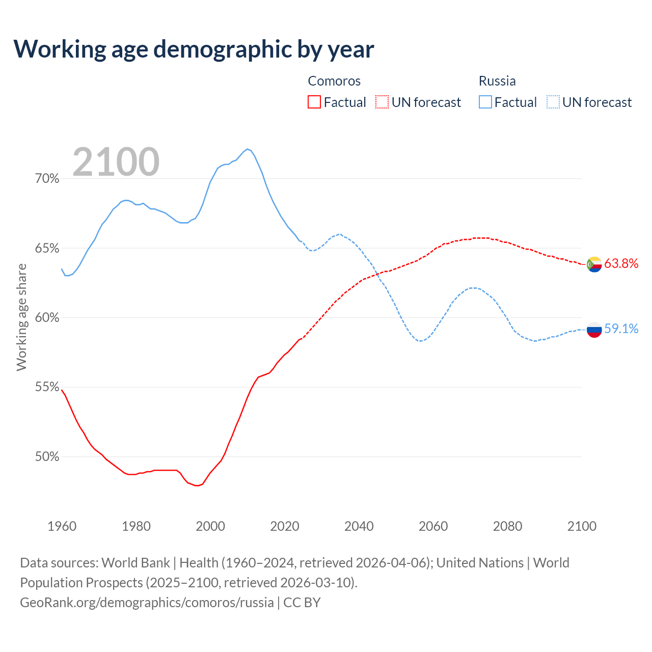 - Comoros has 528K working age adults (aged 15-64) vs 93M in Russia.