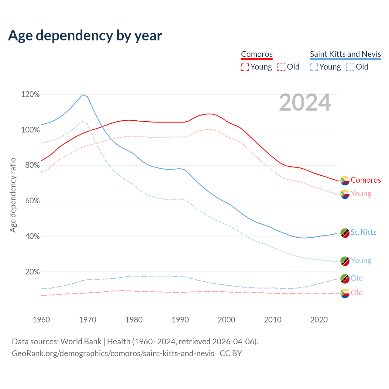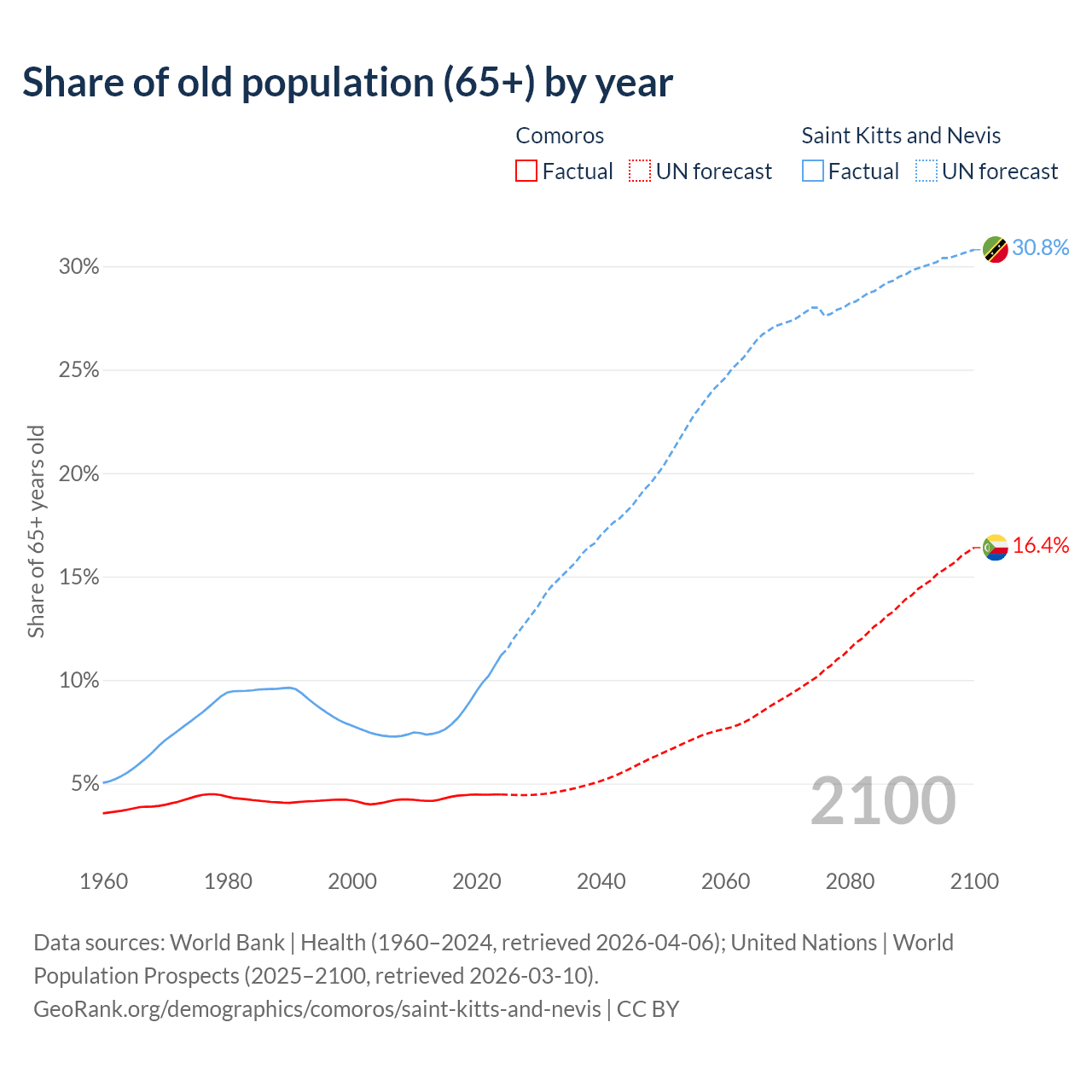 - The share of old-age demographic (65+) in Comoros is 4.47% vs 11.2% in Saint Kitts and Nevis.