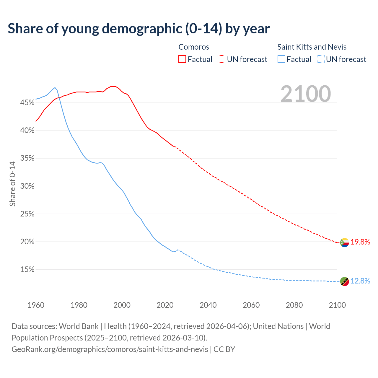 - The share of young demographic (0-15 years old) in Comoros is 37.1% vs 18.2% in Saint Kitts and Nevis.