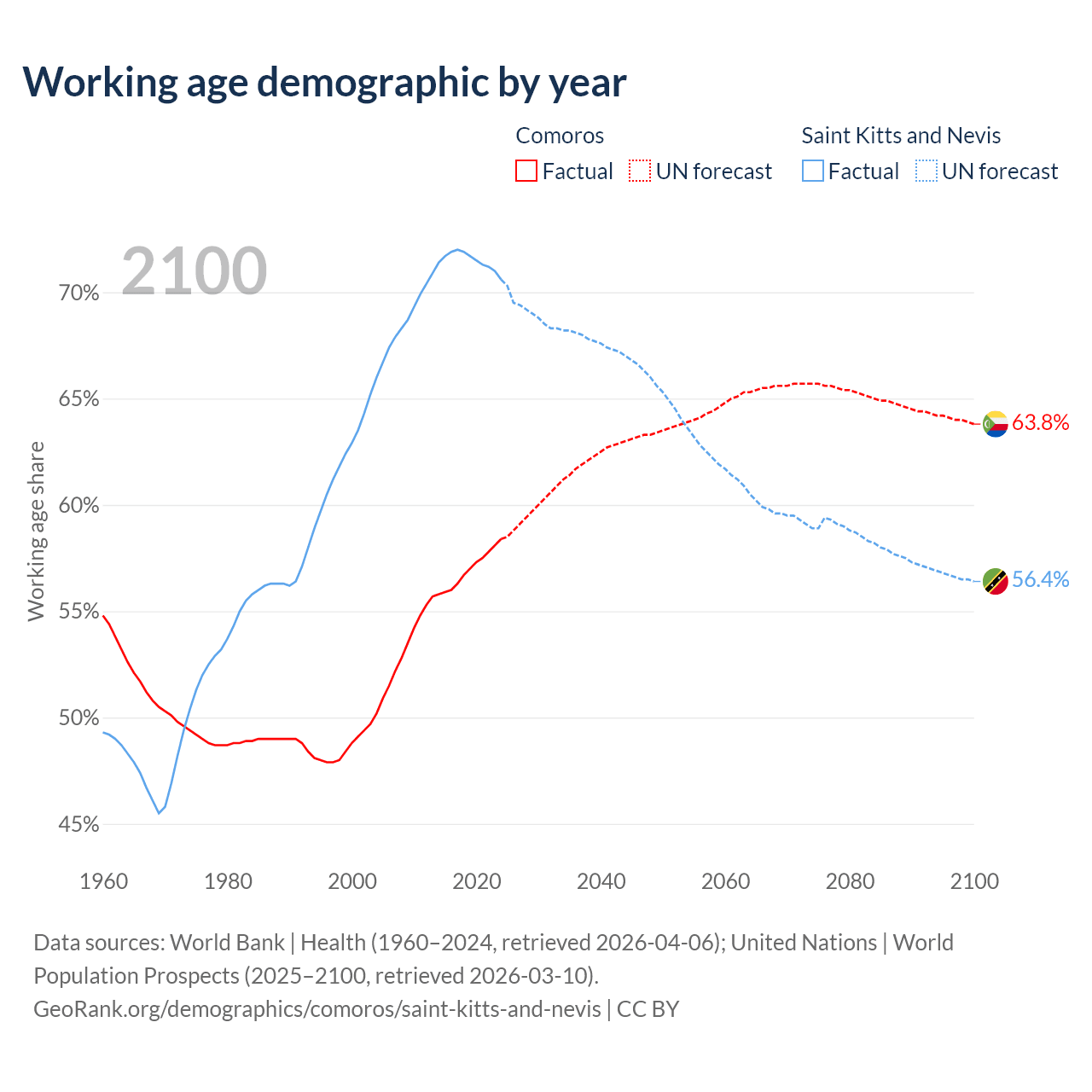- Comoros has 528K working age adults (aged 15-64) vs 33.2K in Saint Kitts and Nevis.