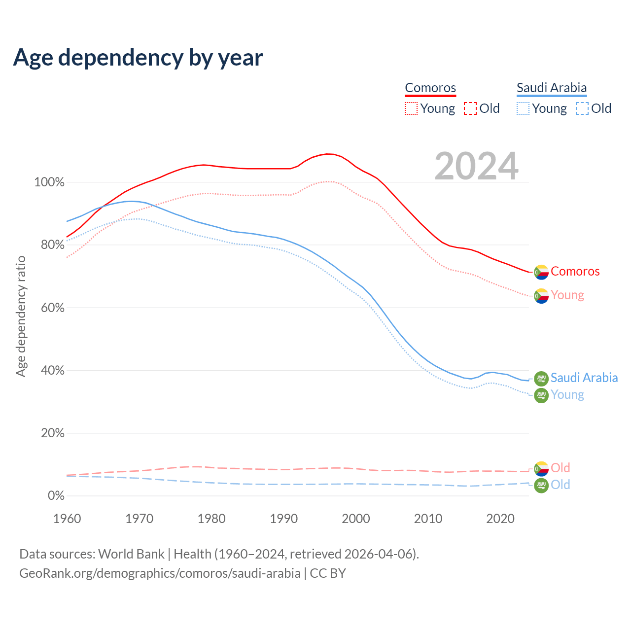 - Comoros is ranked 152/196 by median age (oldest to youngest) vs 98/196 for Saudi Arabia.