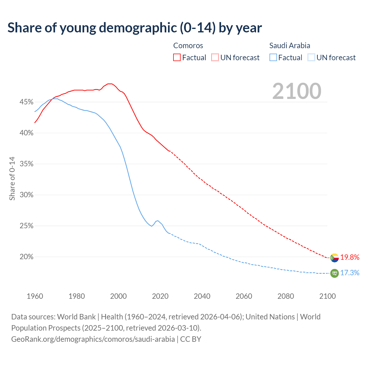 - The share of young demographic (0-15 years old) in Comoros is 37.1% vs 23.8% in Saudi Arabia.